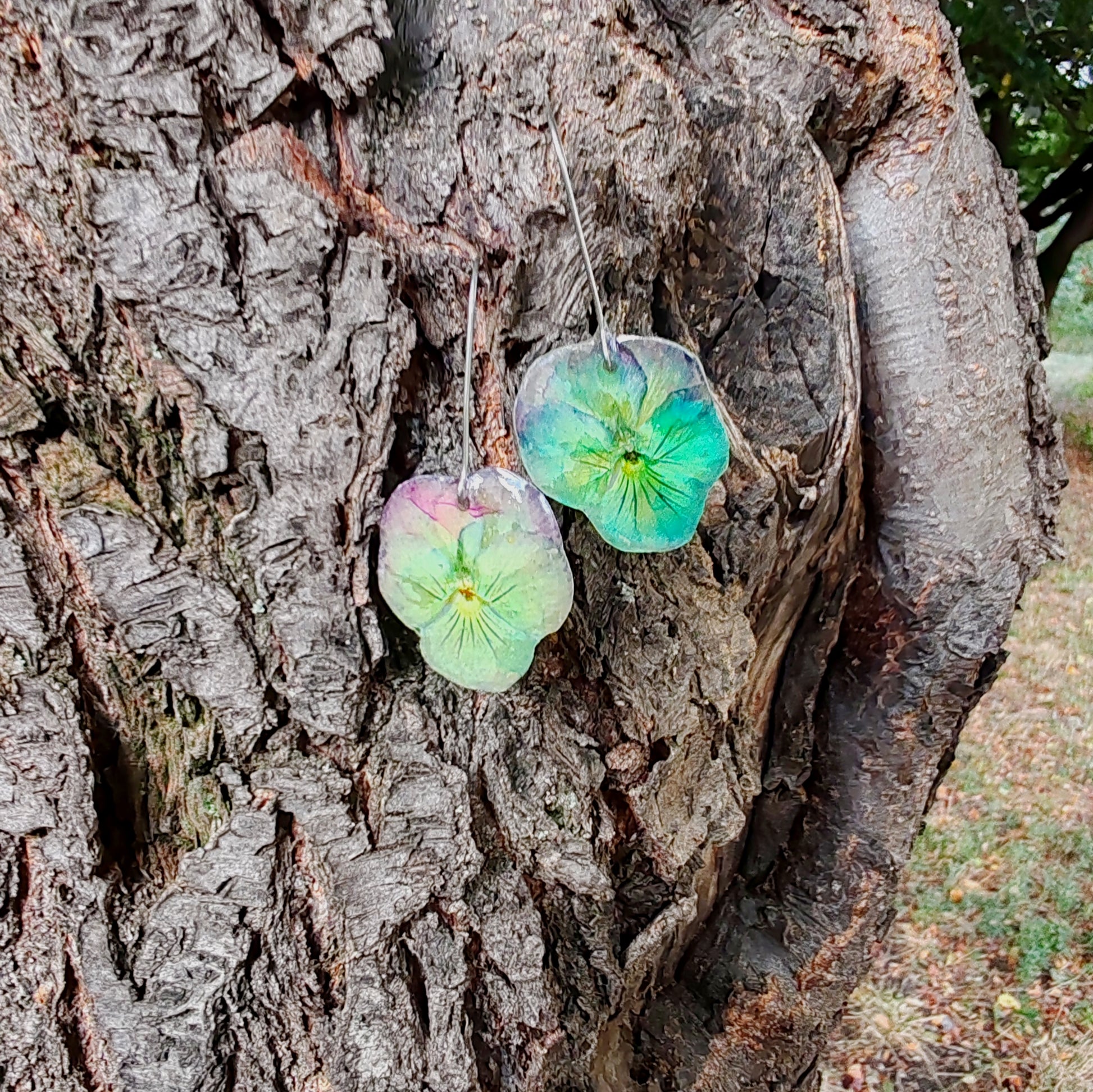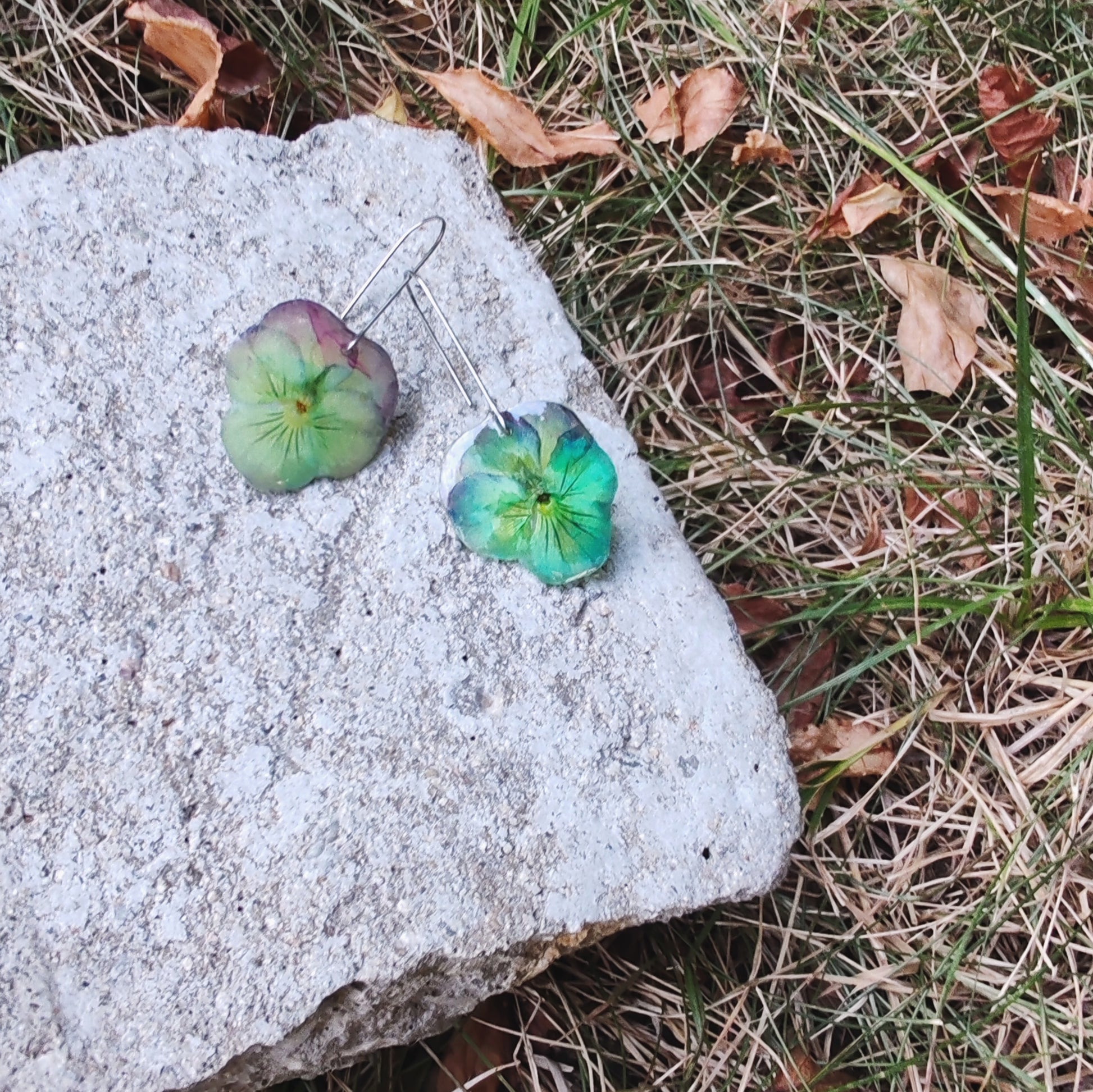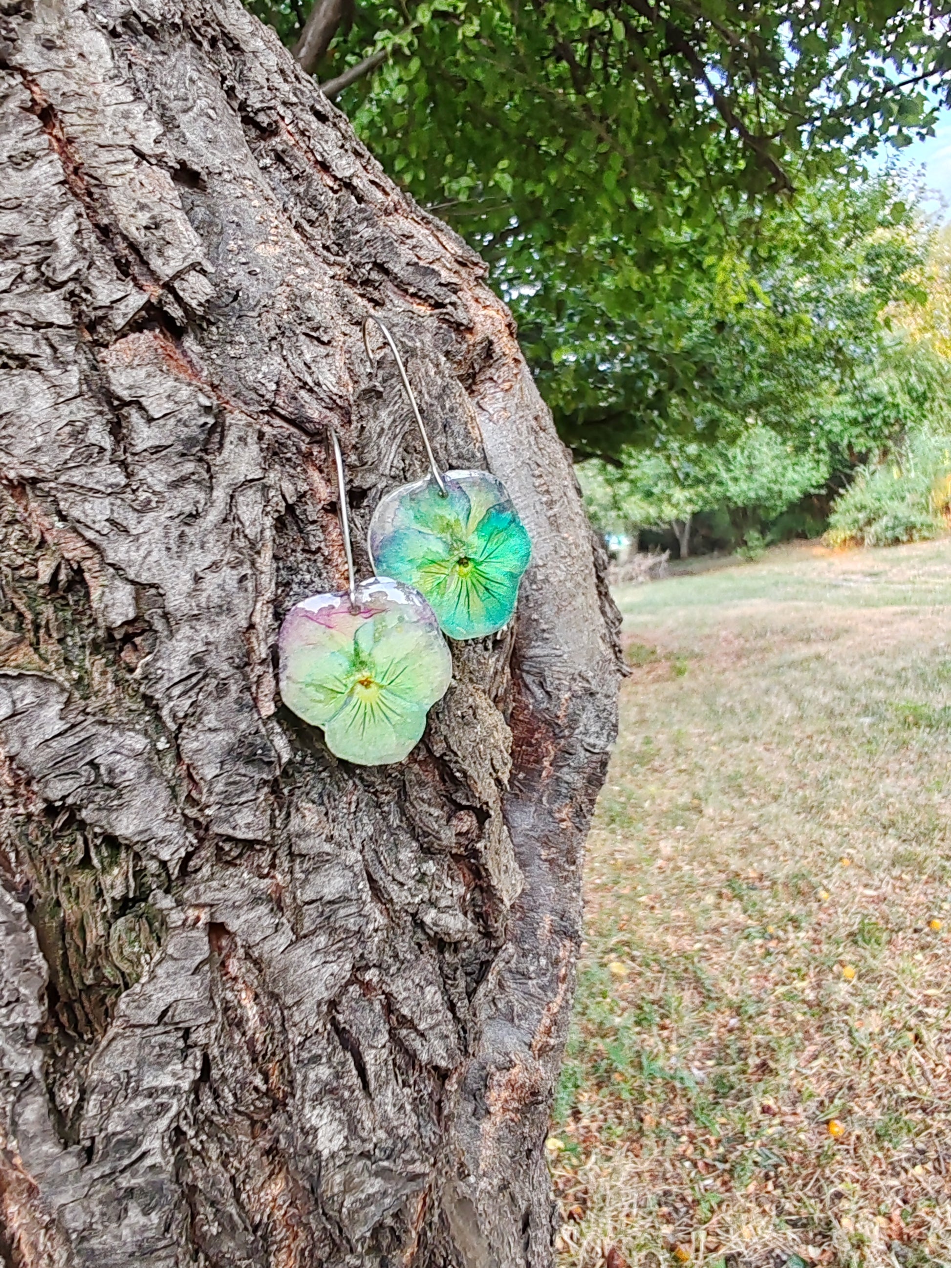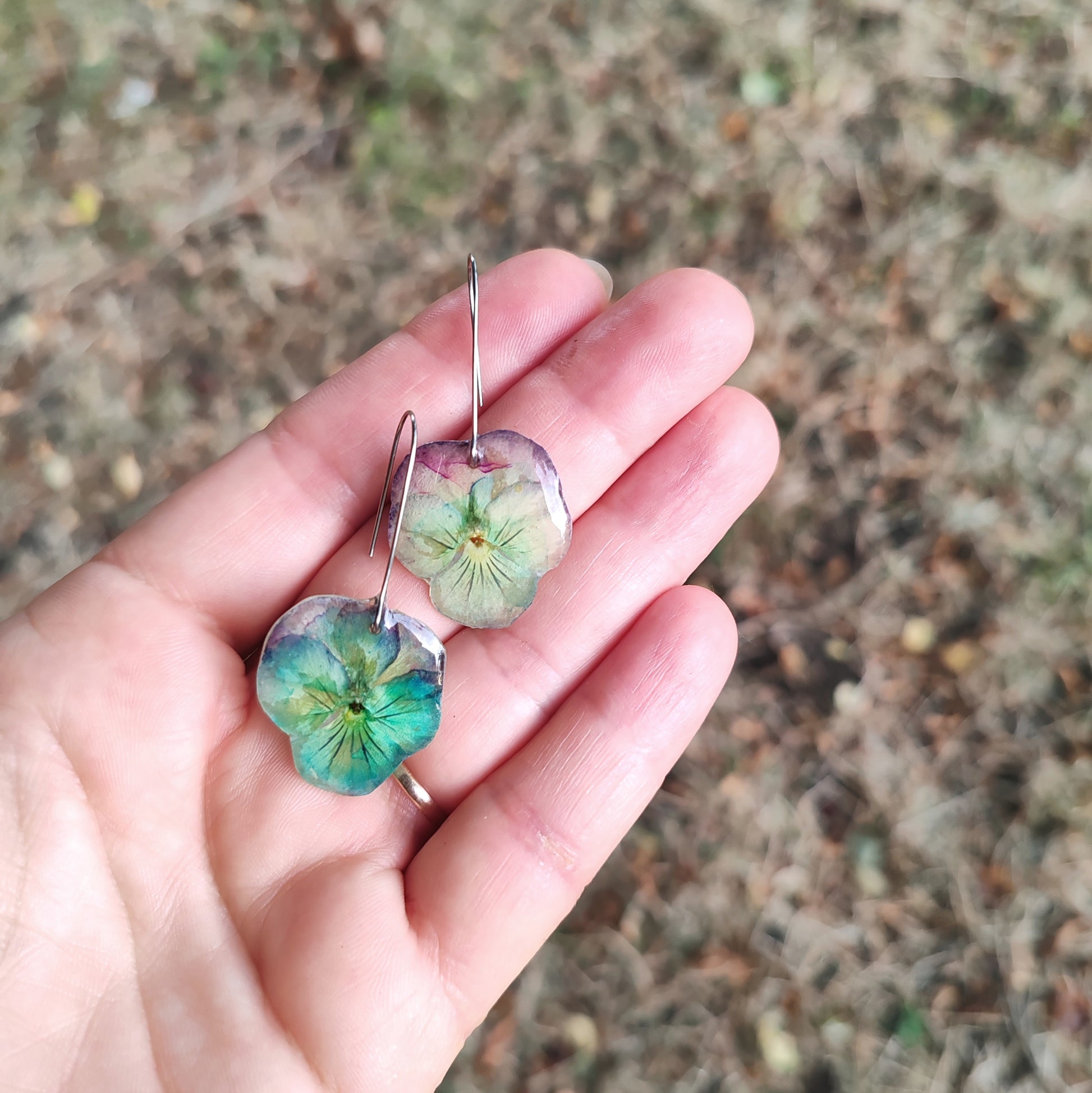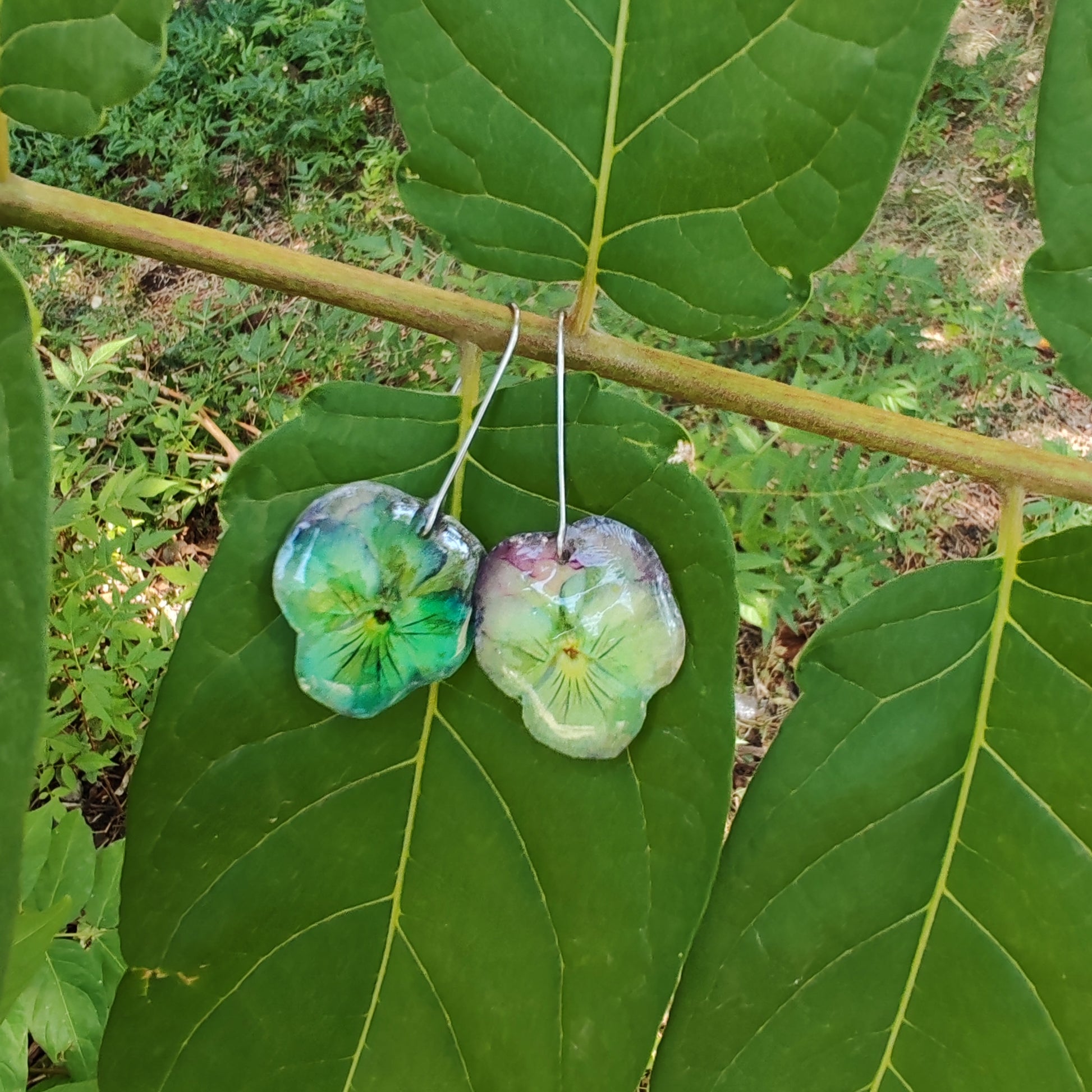 Висящи обеци с със зелени теменужки за дамите, обичащи красотата и цветовете на природата и искащи да я носят навсякъде със себе си.