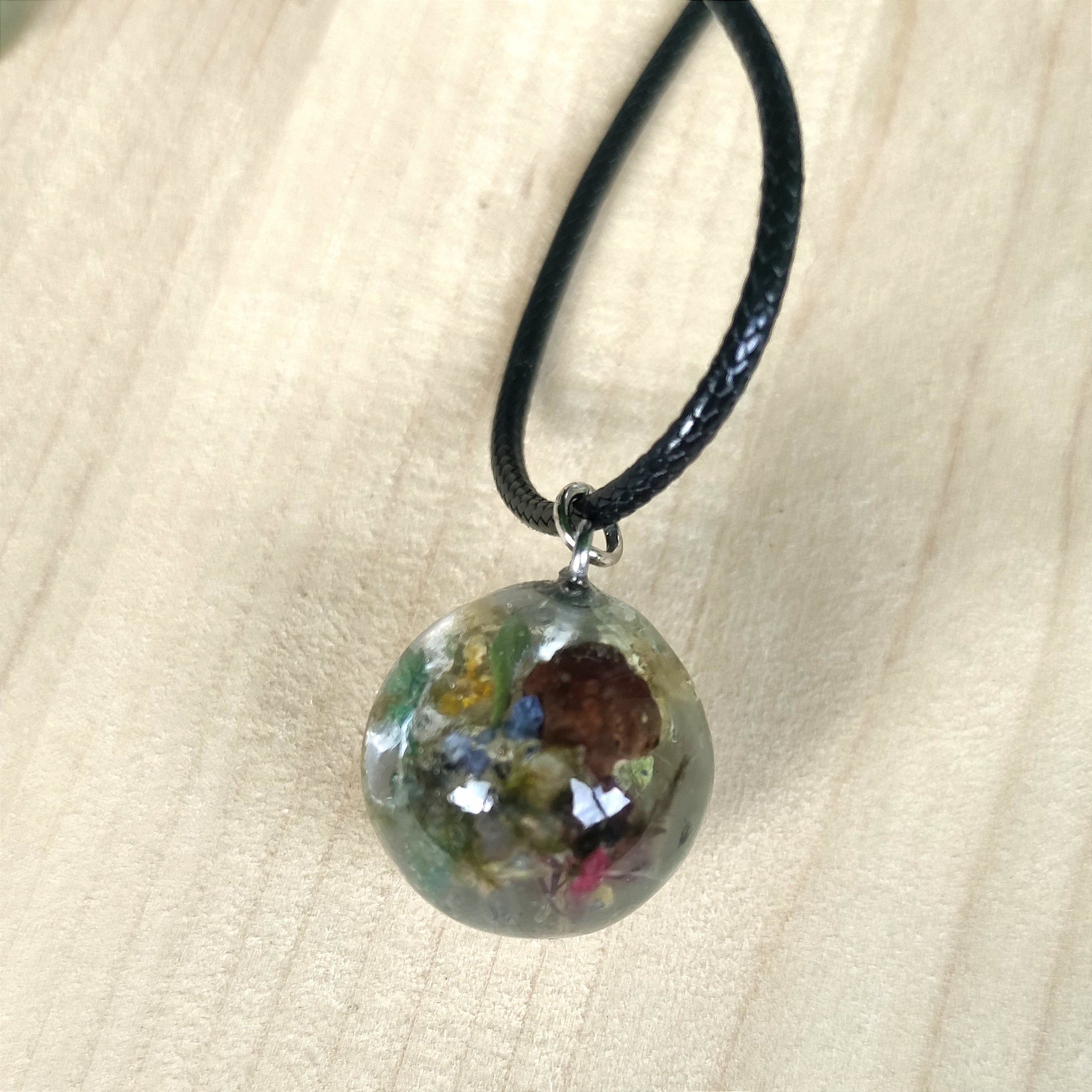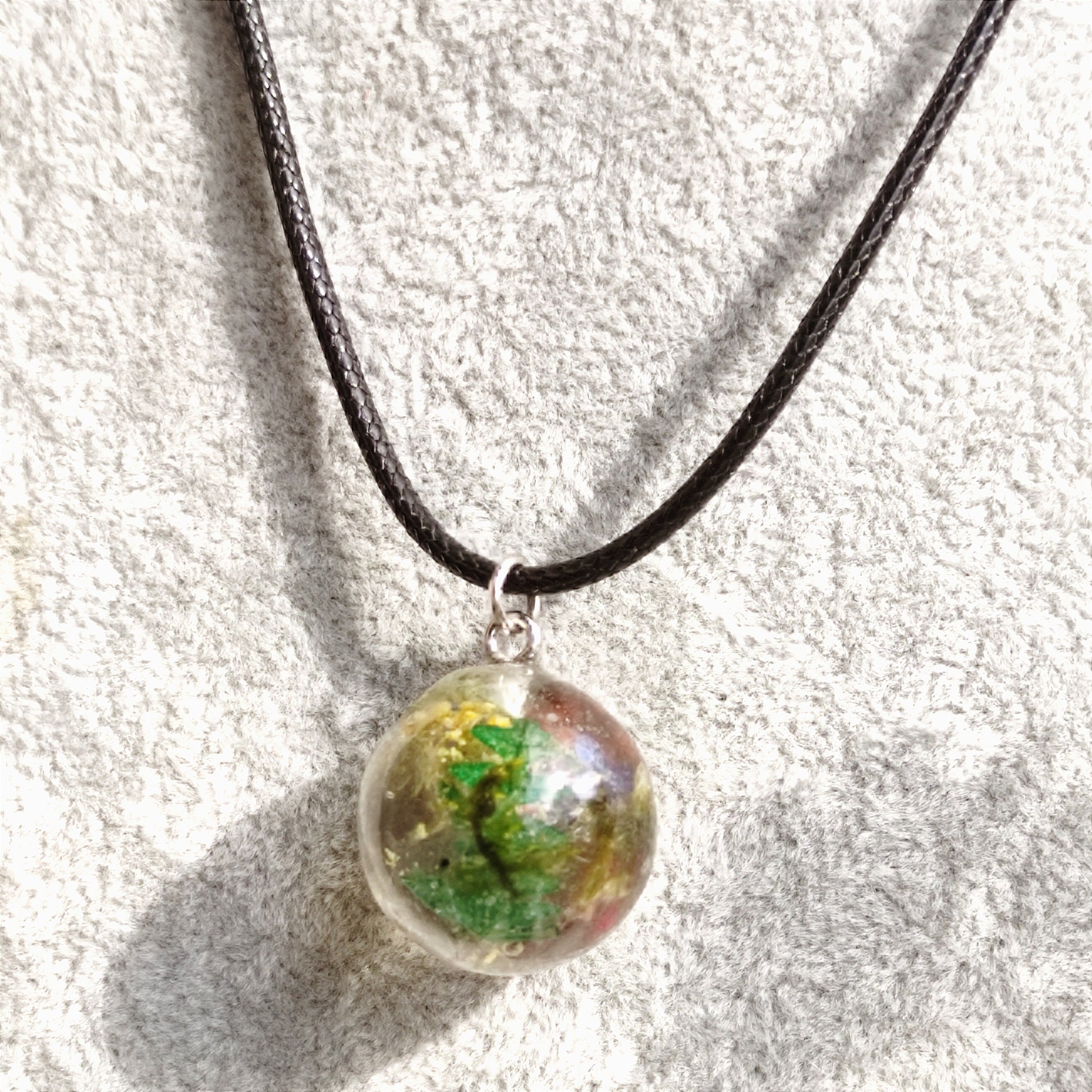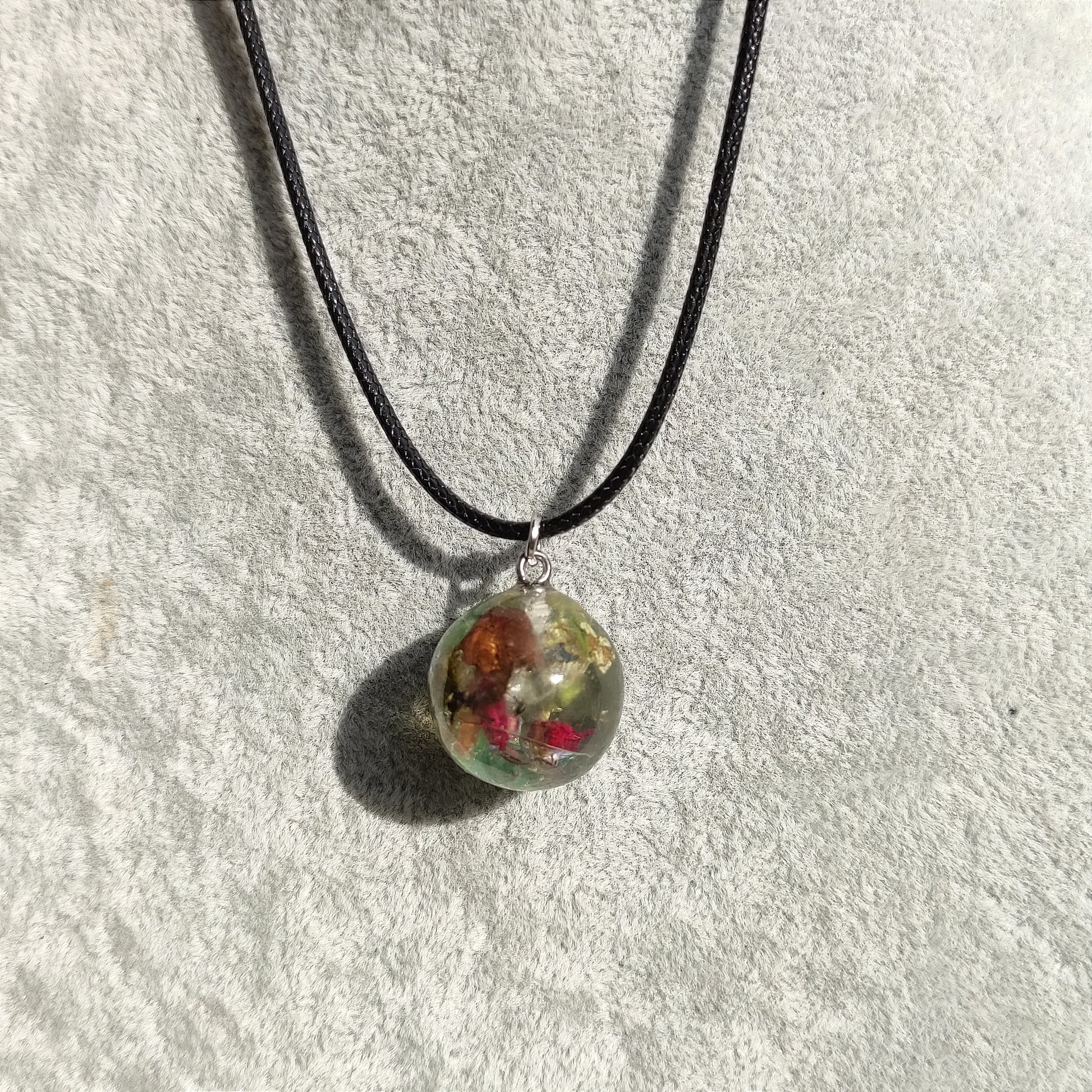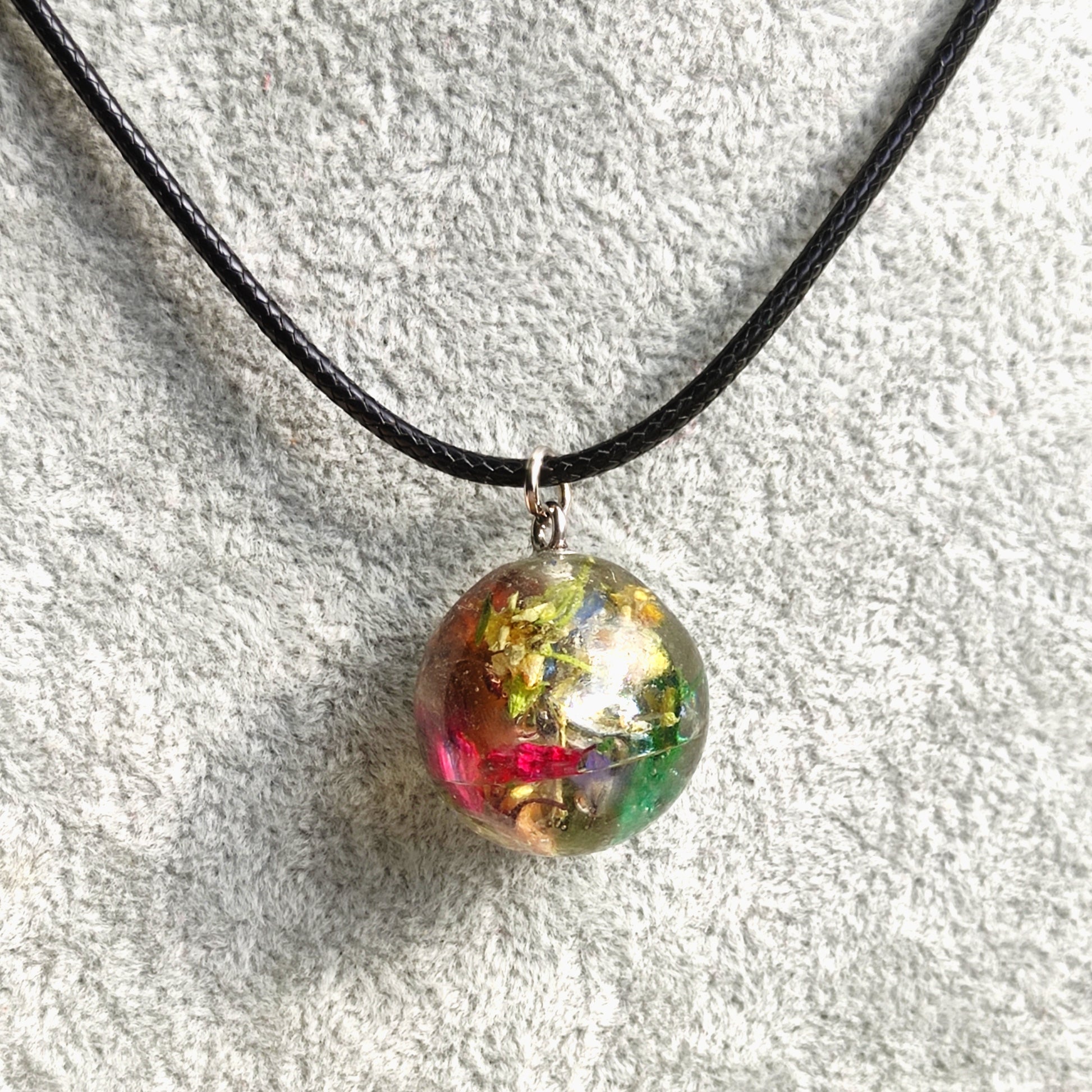 Материал: Бижуто е изработено от напълно безопасна епоксидна смола, специално предназначена за бижутерски цели, което го прави изключително издръжливо. Дължината на верижката е 50 см. Предлагаме го обикновено с кожена, но може да заявите и стомана, както и различна дължина.
