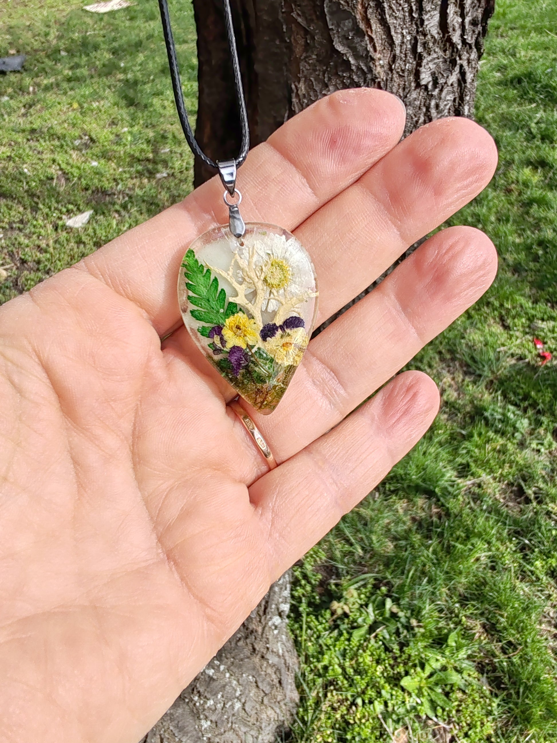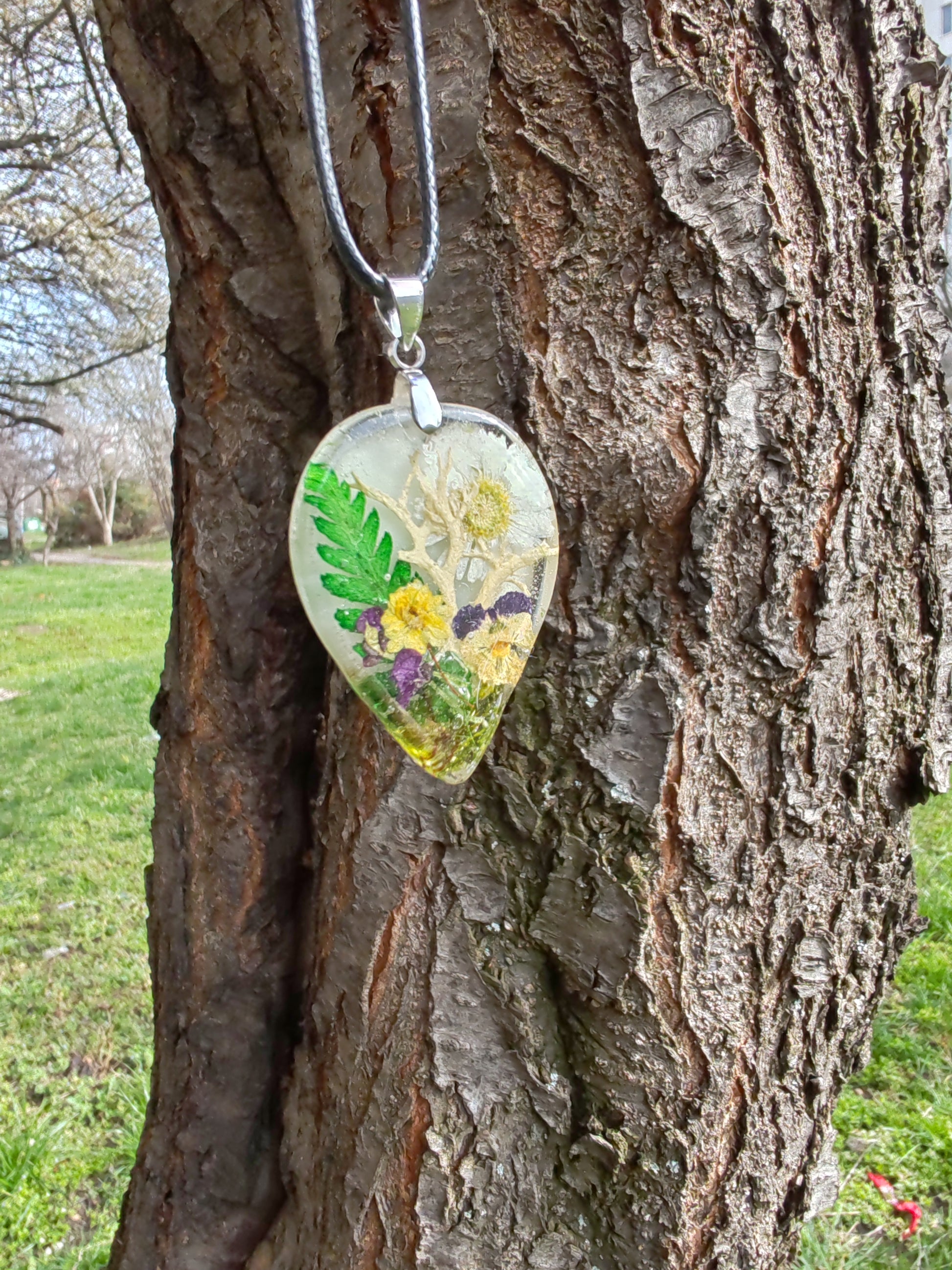 Материал: Бижуто е изработено от напълно безопасна епоксидна смола, специално предназначена за бижутерски цели, което го прави изключително издръжливо. Дължината на верижката е 50 см. Предлагаме го обикновено с кожена, но може да заявите и стомана, както и различна дължина.