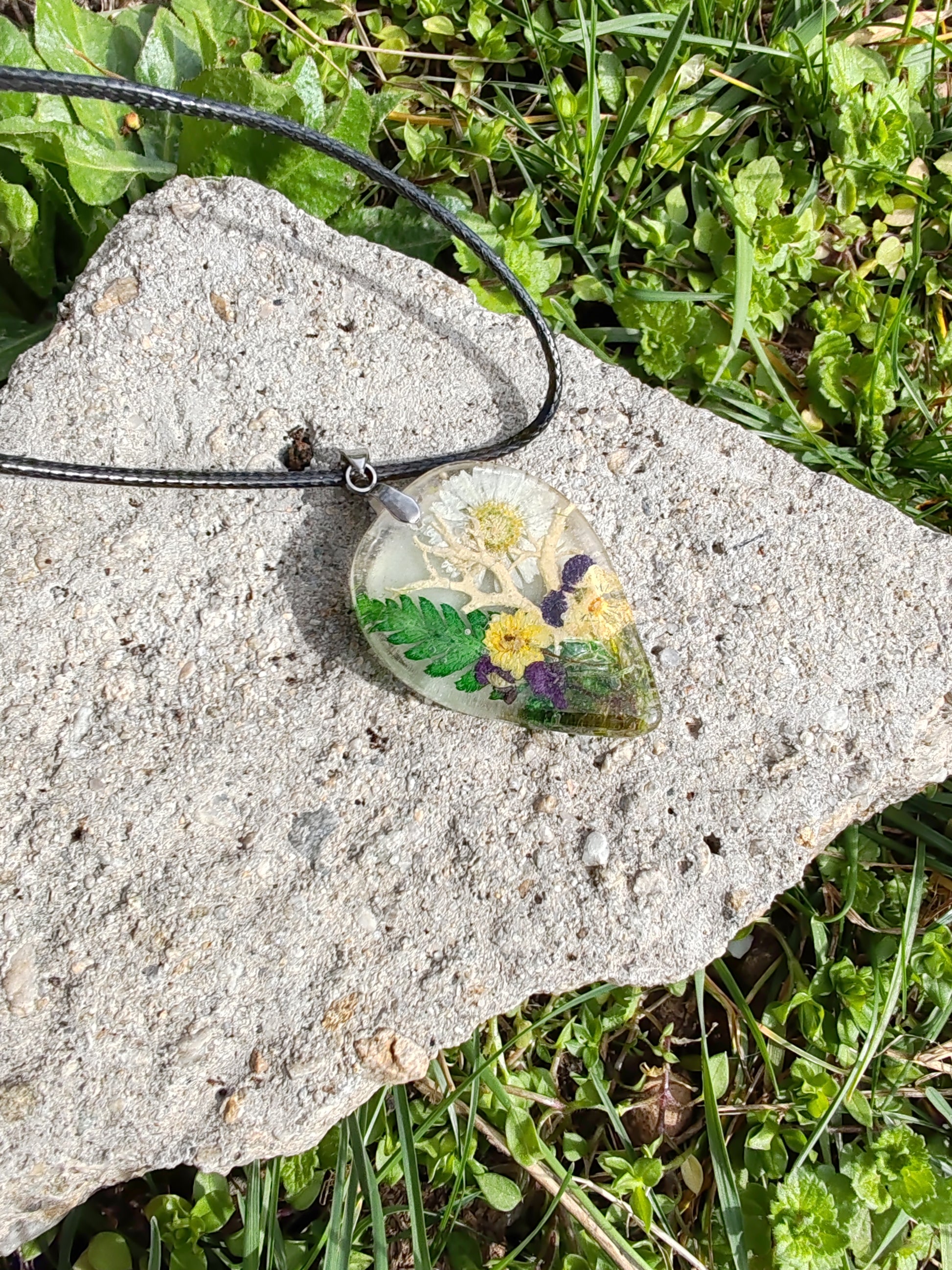 Колие с горски пейзаж, което е събрало в себе си толкова много сушени цветя, поставени на светещ в тъмното фон.