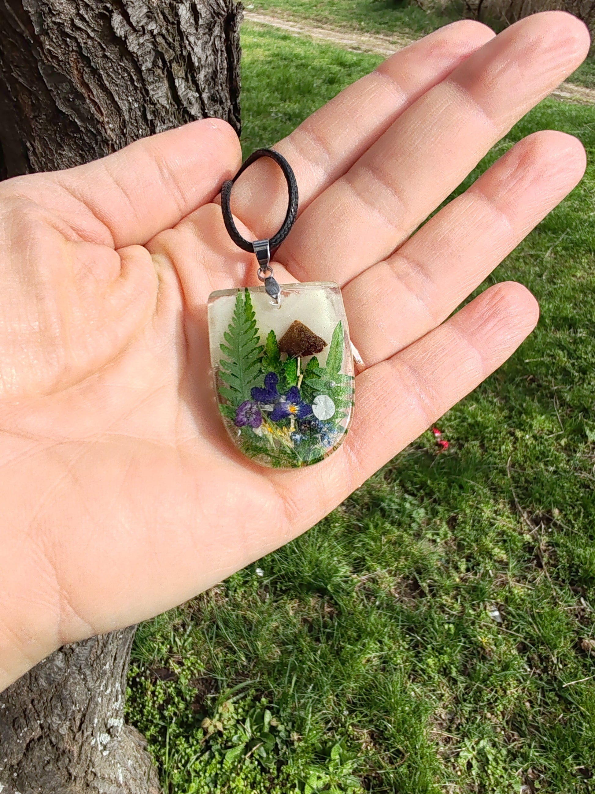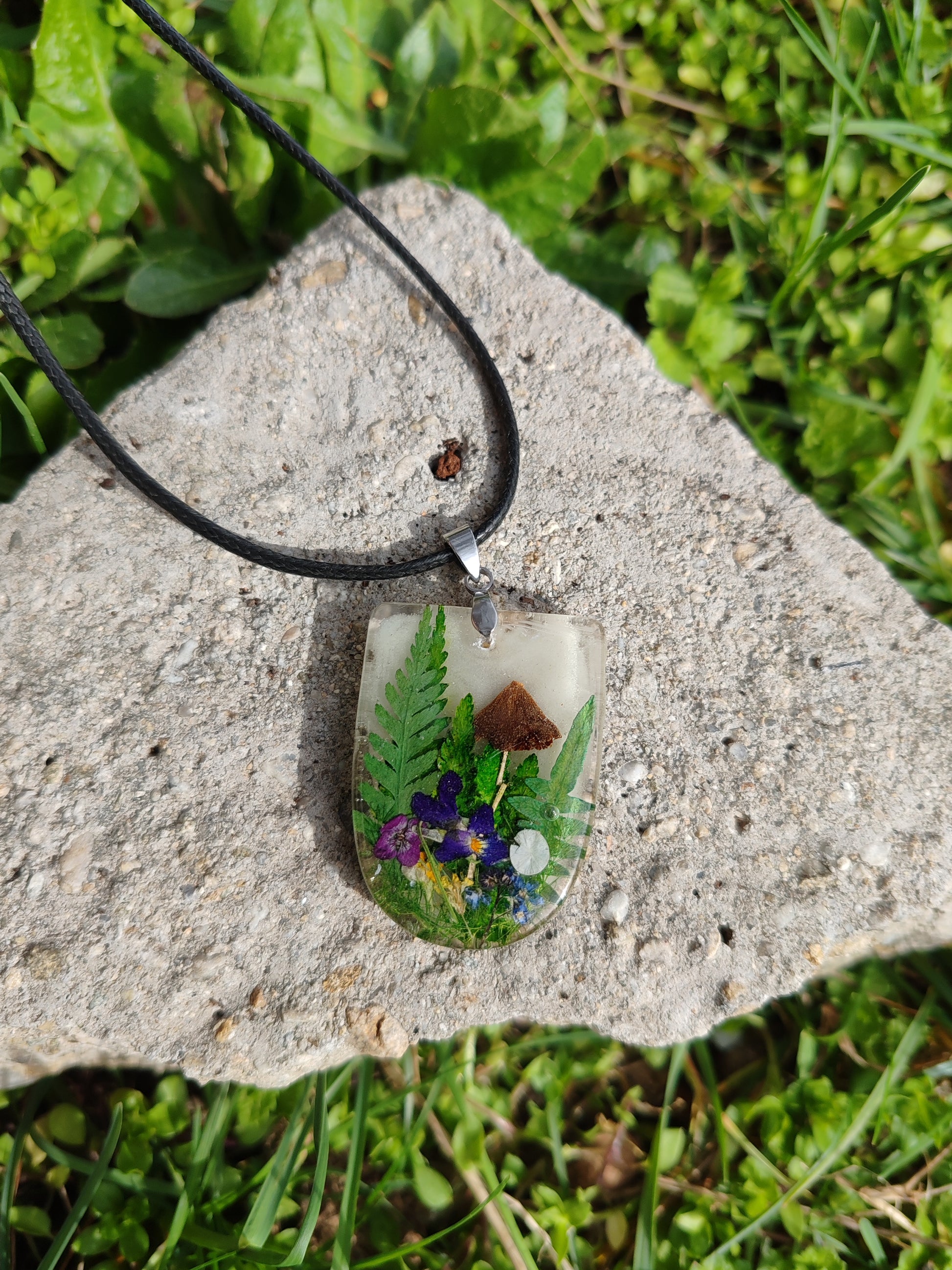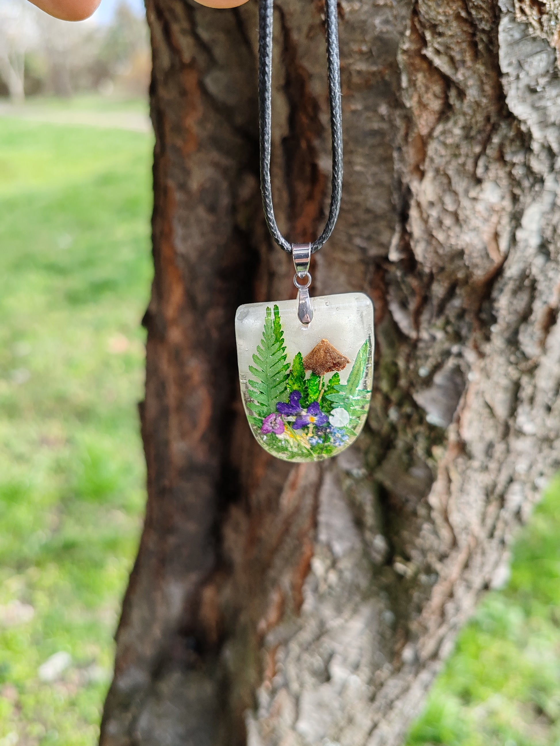 Колие с горски пейзаж, което е събрало в себе си много сушени цветя и гъбка, поставени на светещ в тъмното фон.