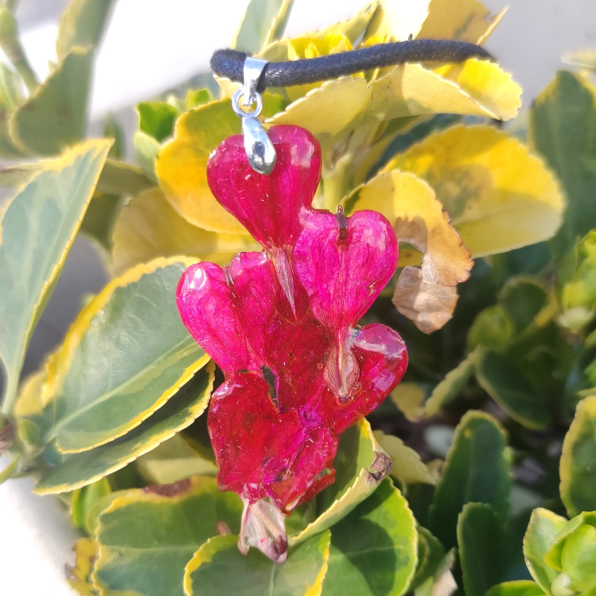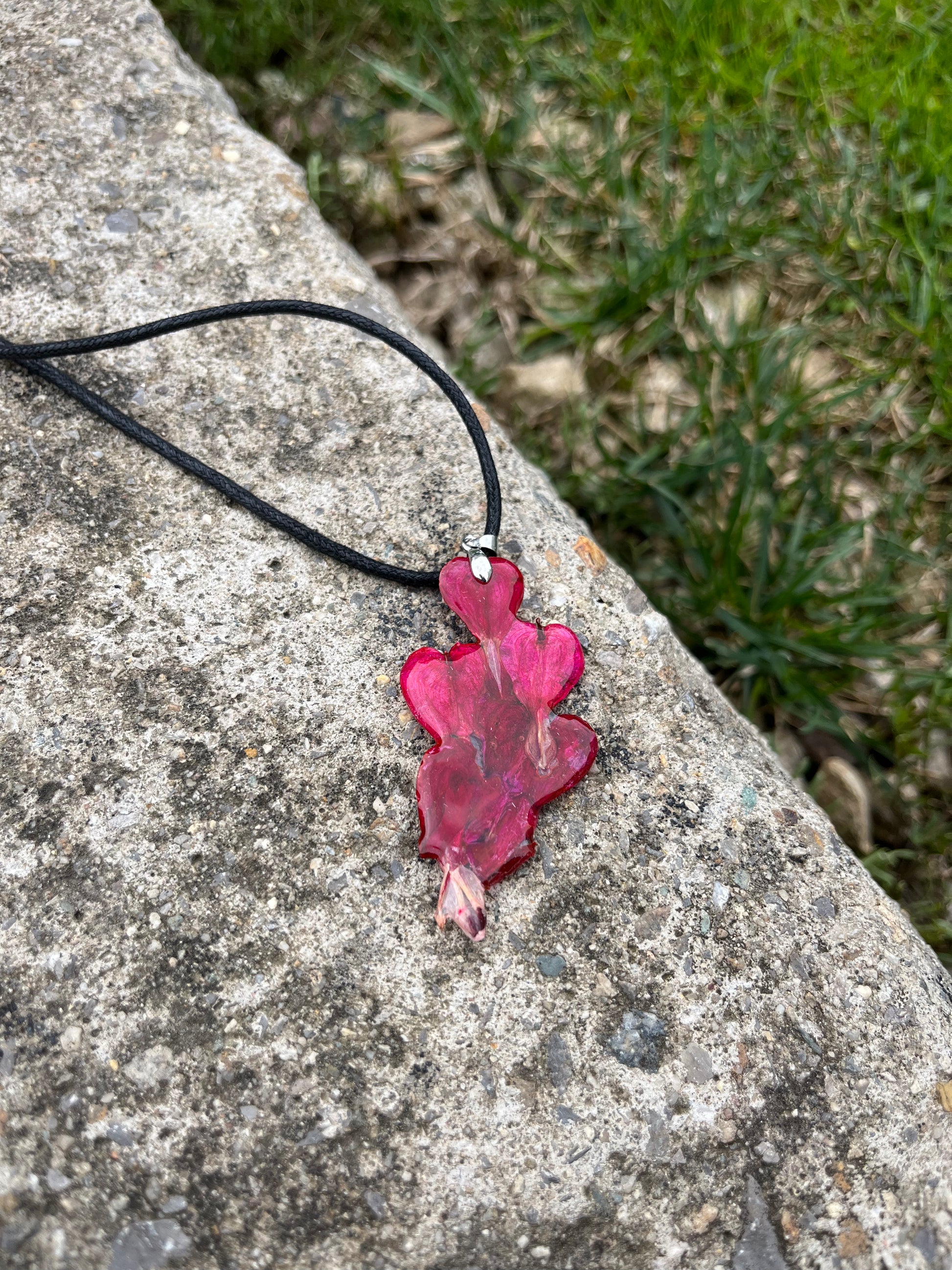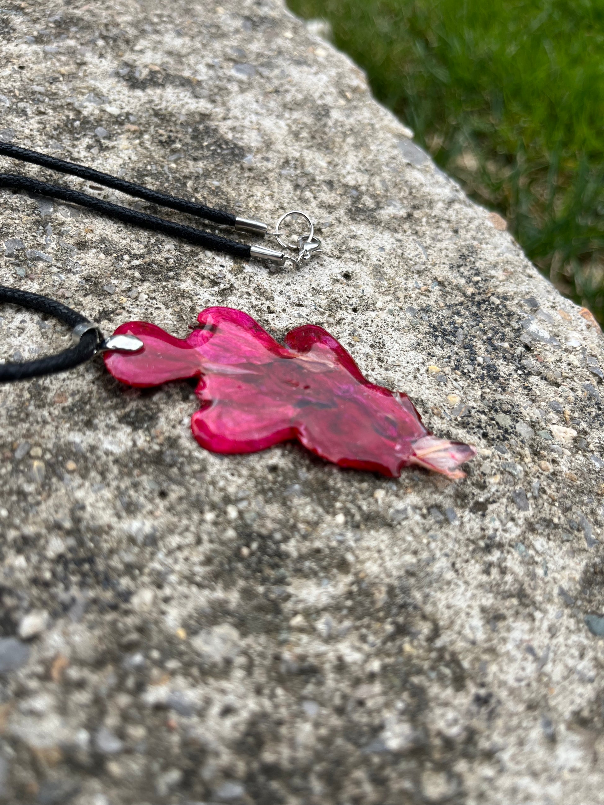 Материал: Бижуто е изработено от напълно безопасна епоксидна смола, специално предназначена за бижутерски цели, което го прави изключително издръжливо. Дължината на верижката е 50 см. Предлагаме го обикновено с кожена, но може да заявите и стомана, както и различна дължина.