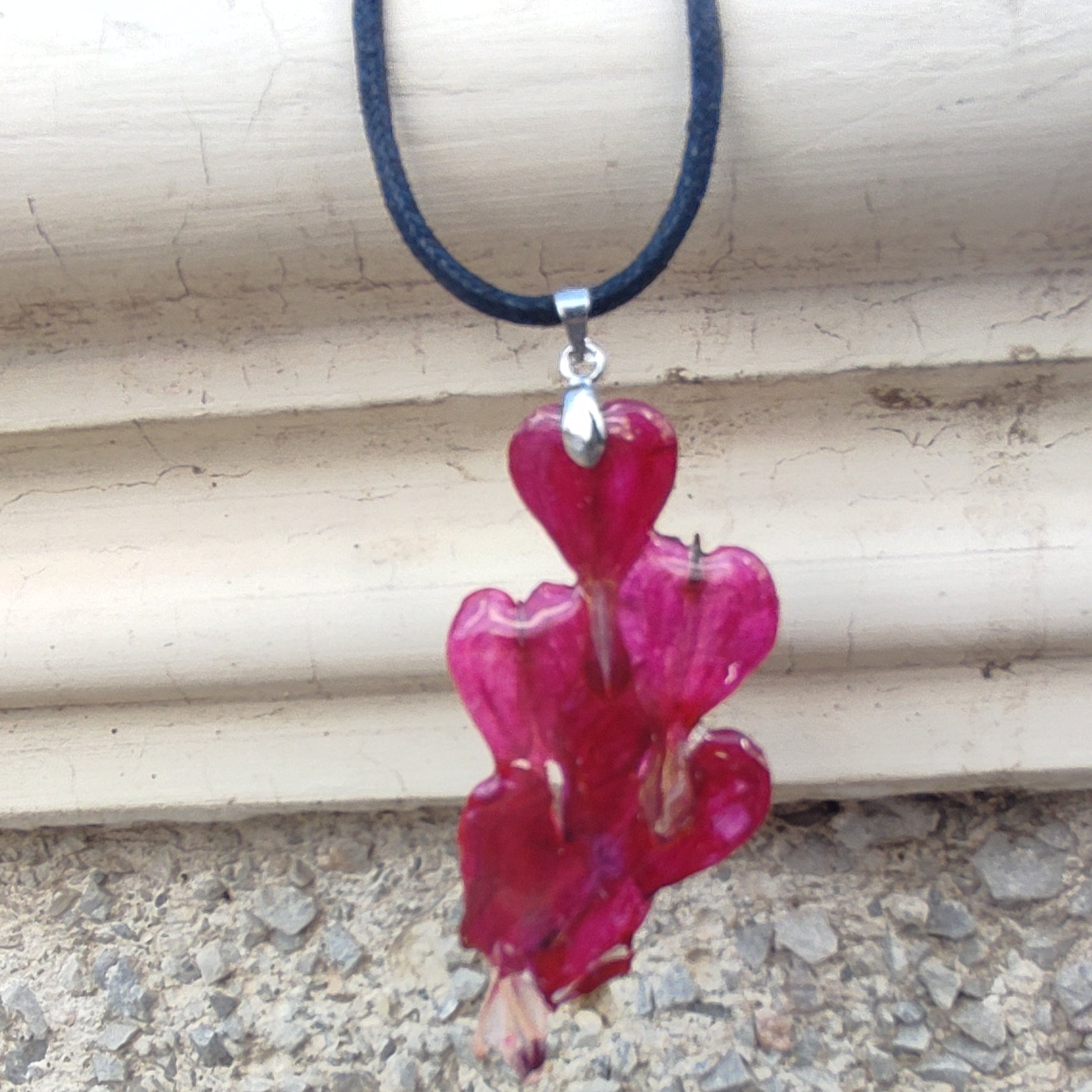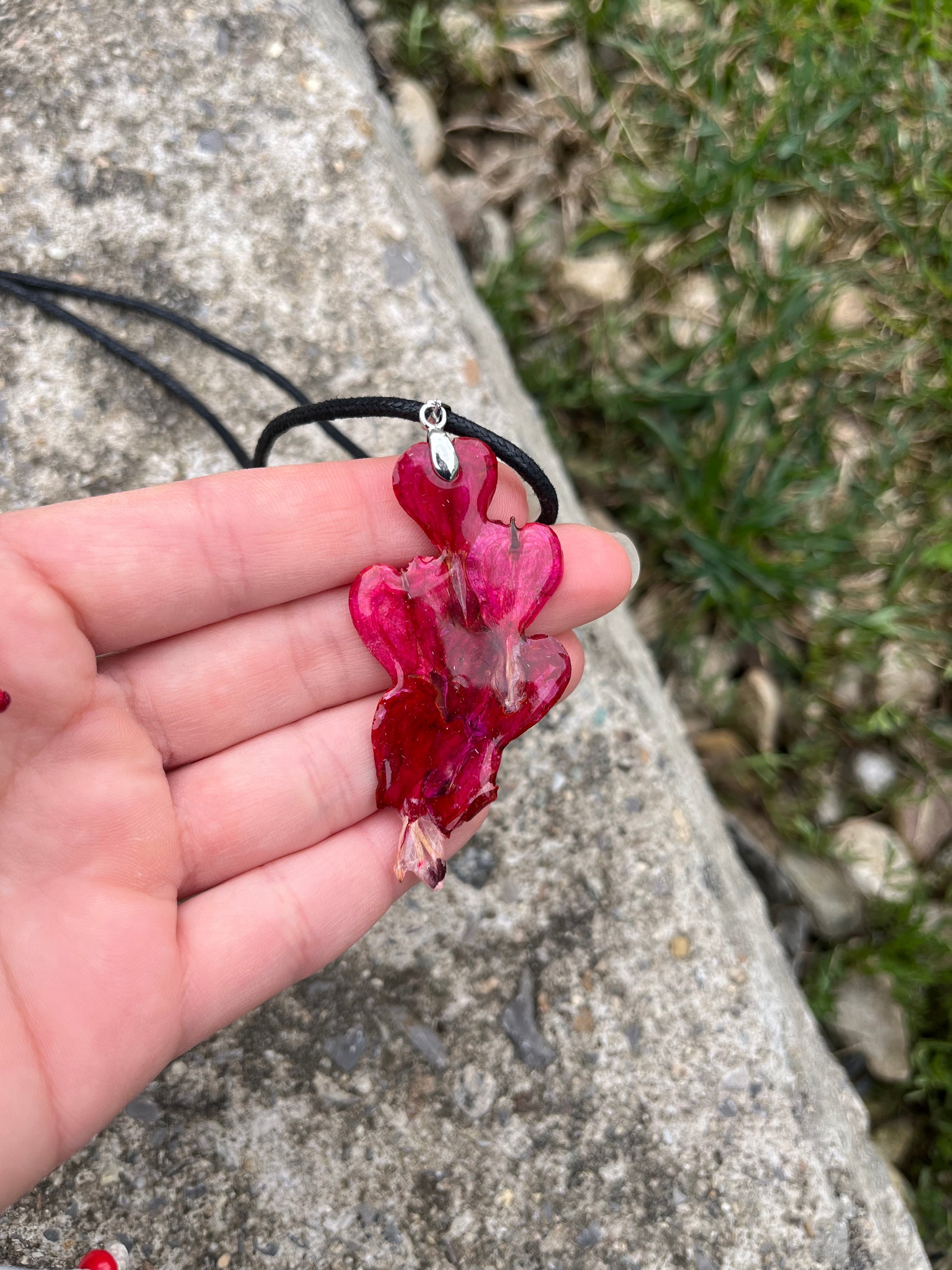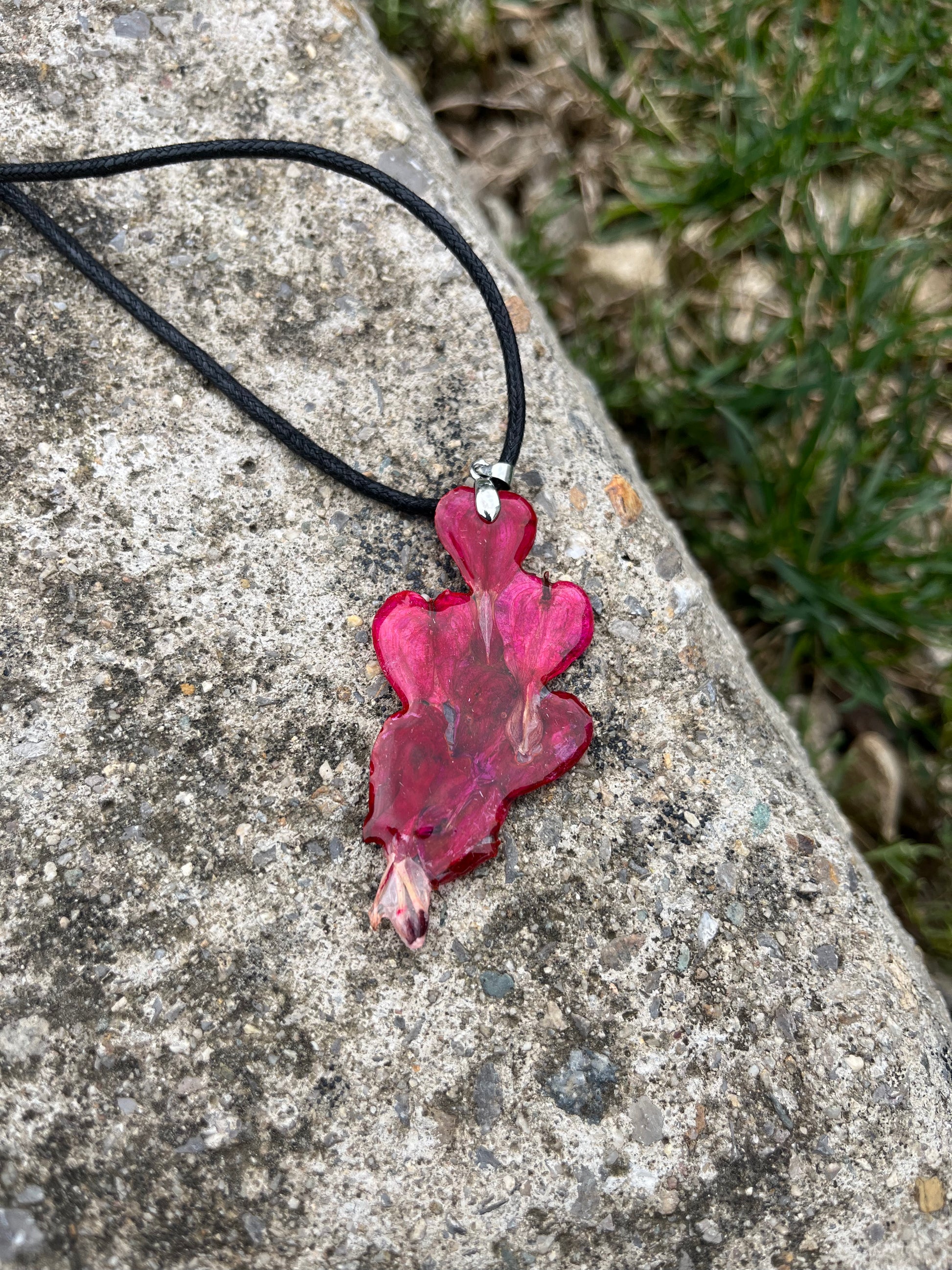 Материал: Бижуто е изработено от напълно безопасна епоксидна смола, специално предназначена за бижутерски цели, което го прави изключително издръжливо. Дължината на верижката е 50 см. Предлагаме го обикновено с кожена, но може да заявите и стомана, както и различна дължина.