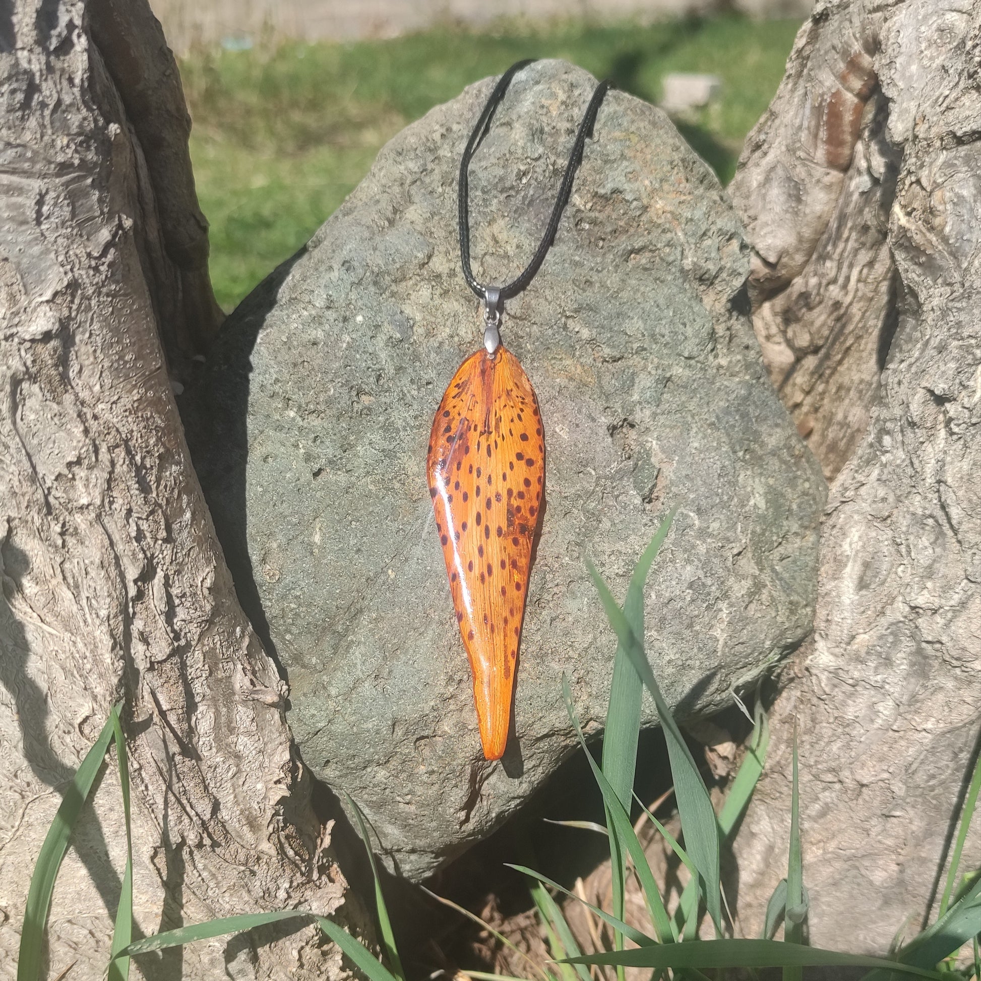 Материал: Бижуто е изработено от напълно безопасна епоксидна смола, специално предназначена за бижутерски цели, което го прави изключително издръжливо. Дължината на верижката е 50 см. Предлагаме го обикновено с кожена, но може да заявите и стомана, както и различна дължина.