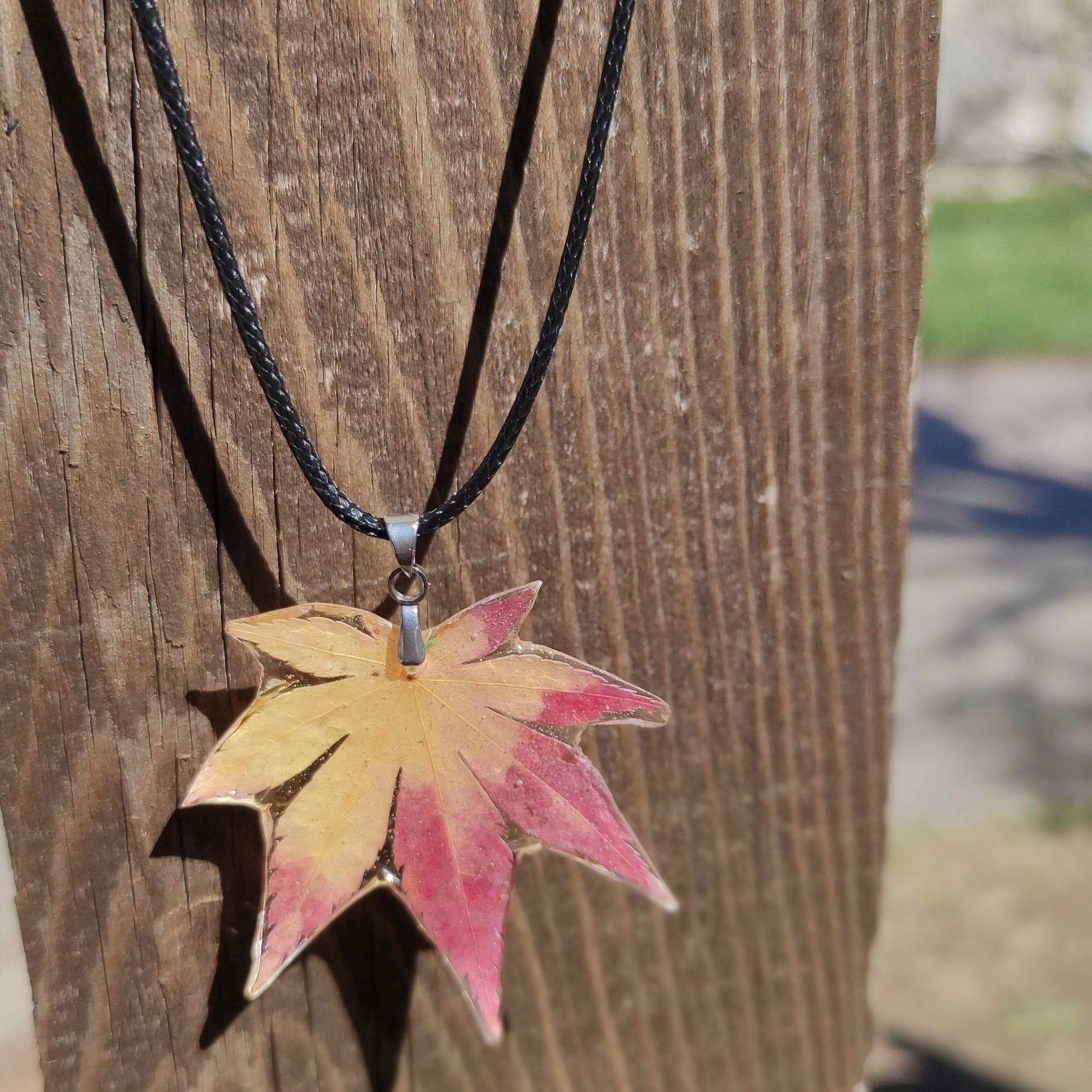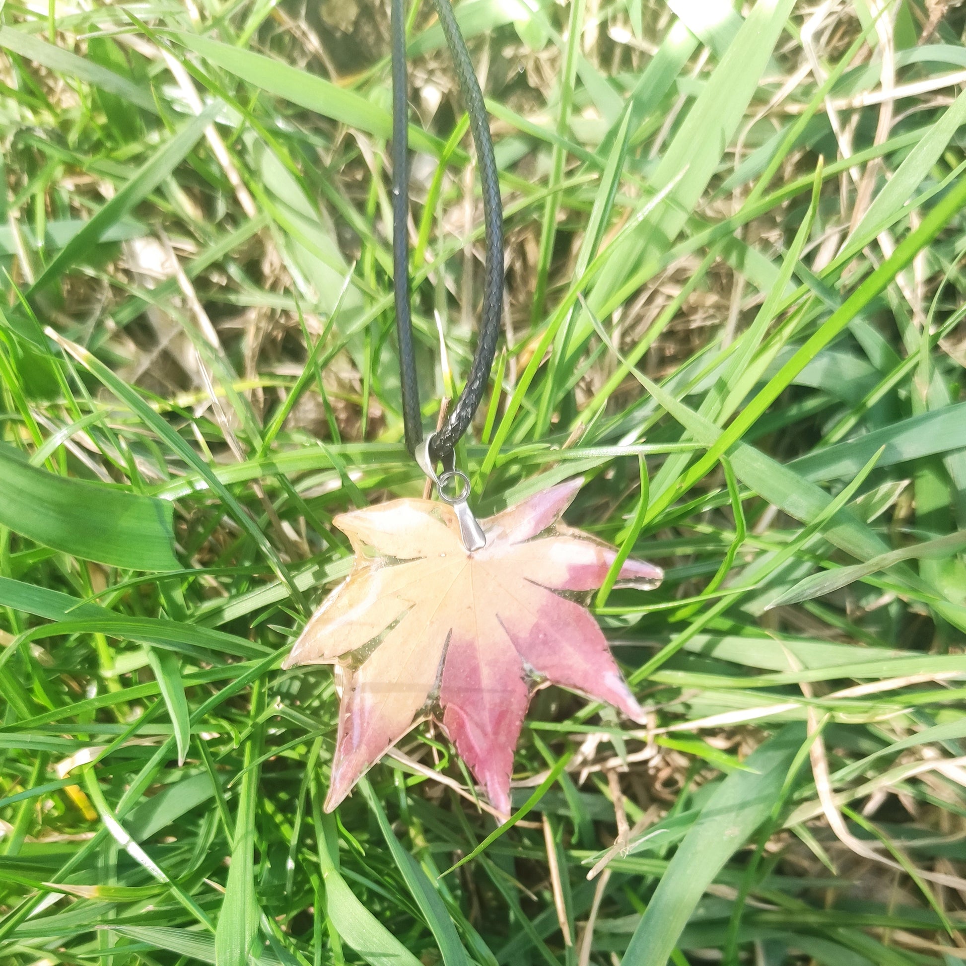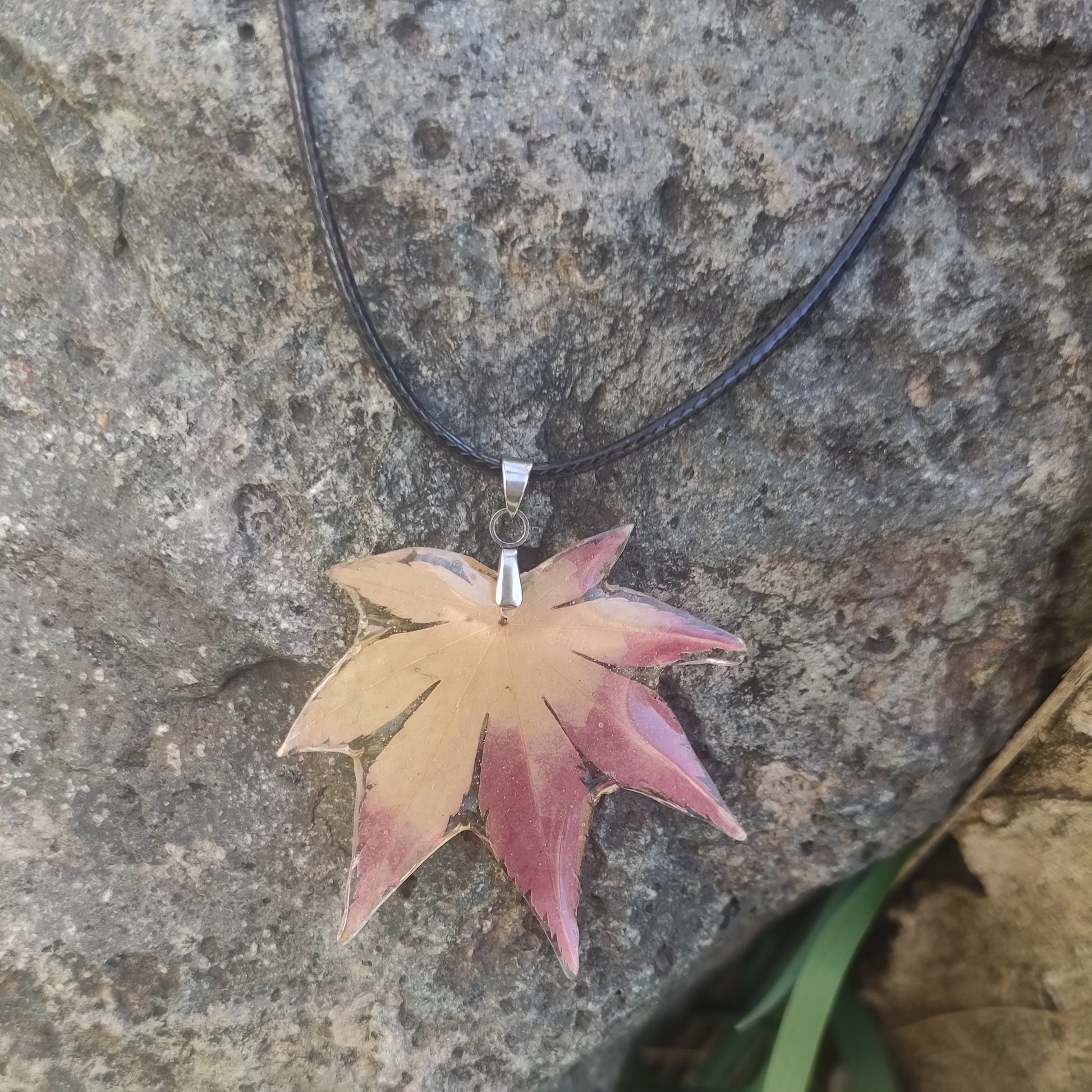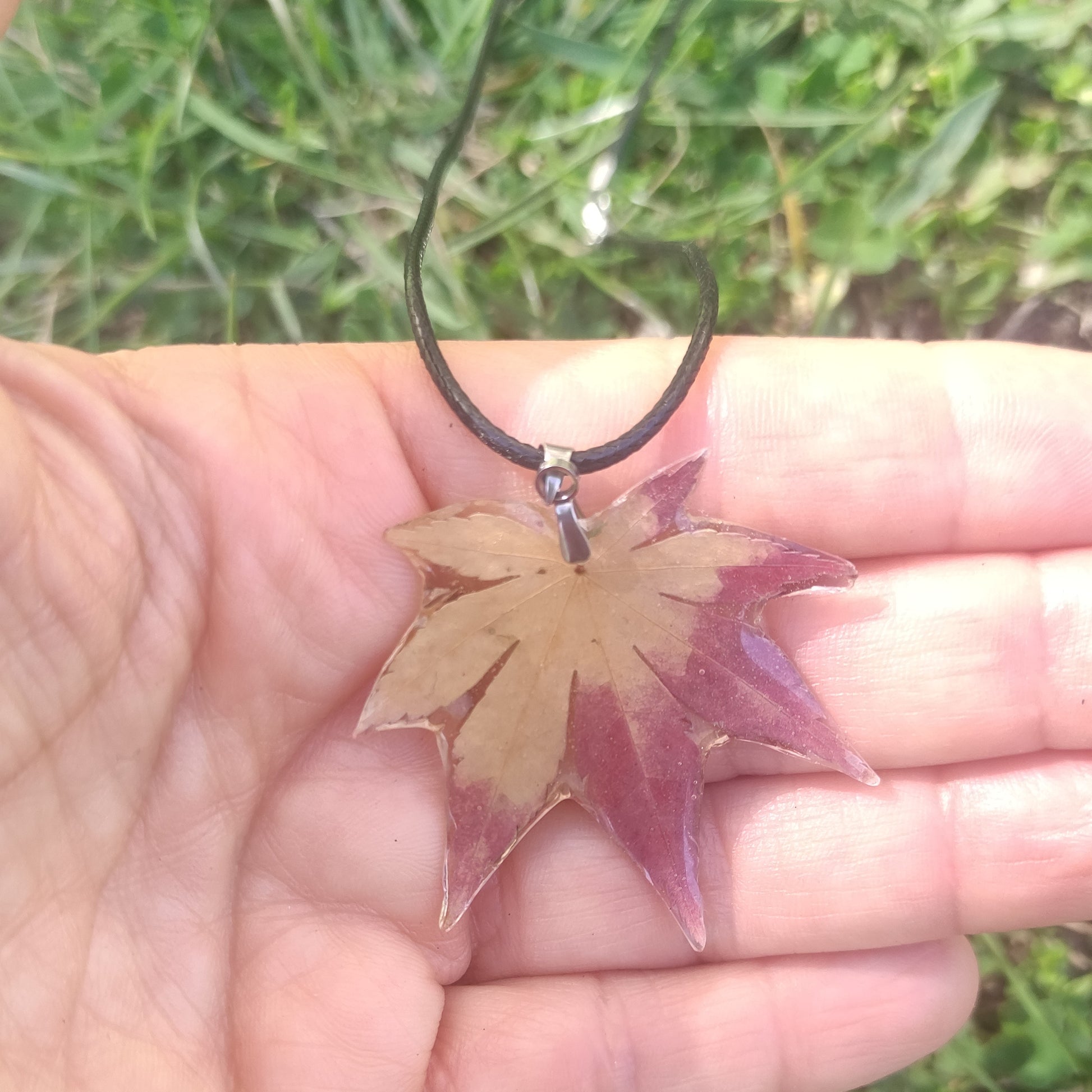 Красиво колие от кленов лист, който е съхранен в епоксидна смола, за да украсява дълги години дамската шия. Кленовият лист – символ на плодородие и вечна любов в китайската и японската култура.