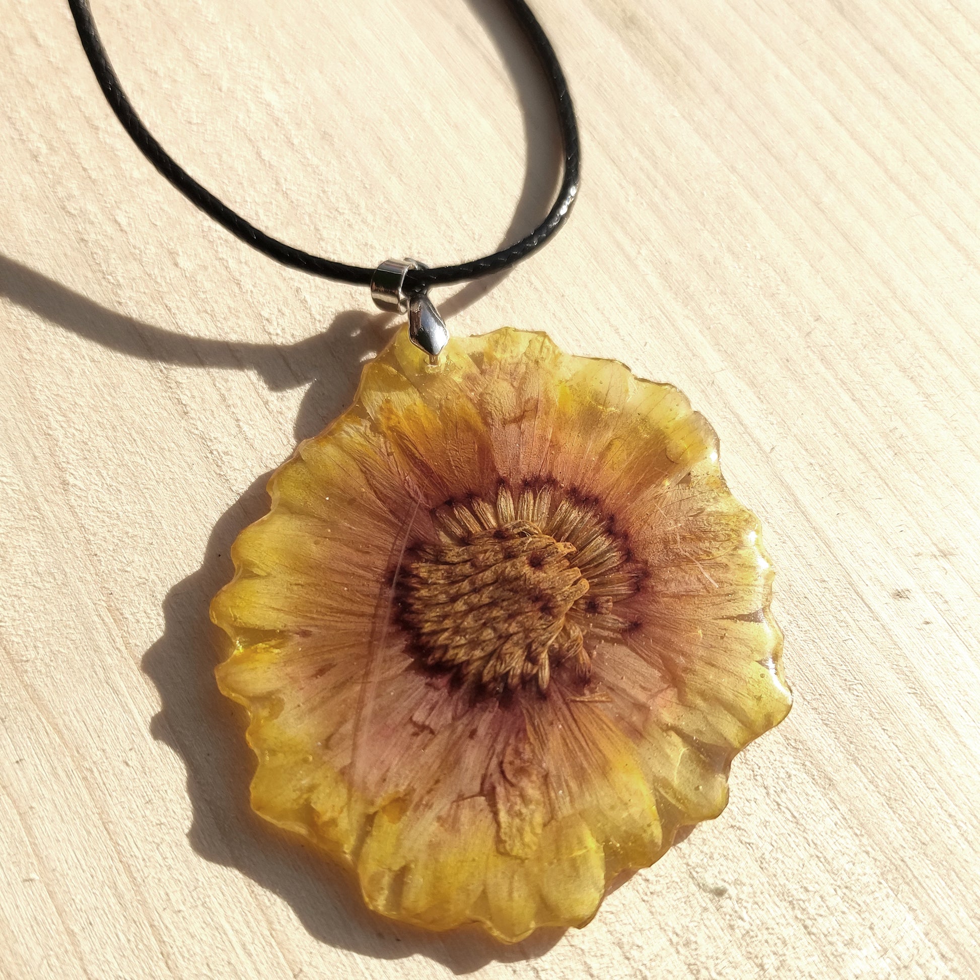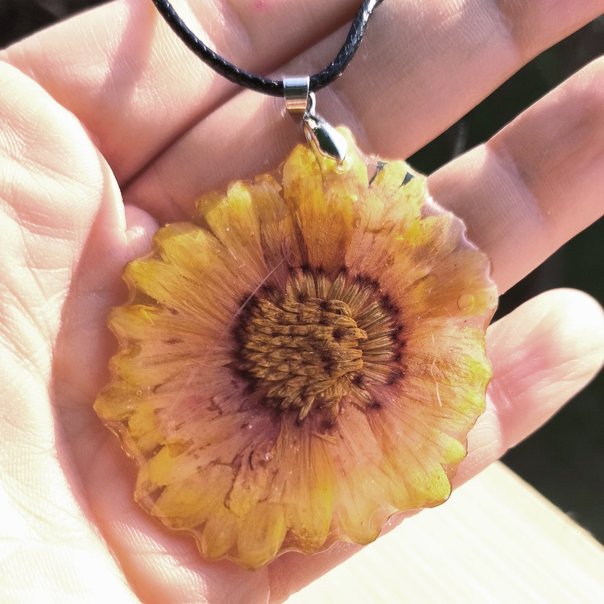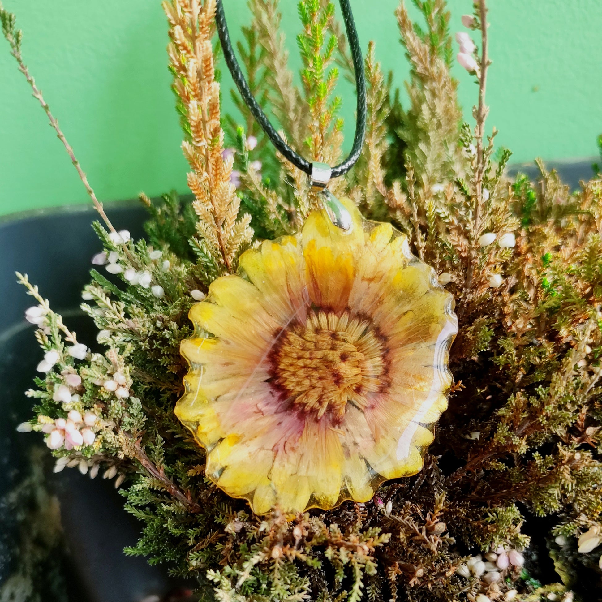 Колие с градинско цвете нежно обвито в епоксидна смола. То ще е чудесен спомен за теб или приятелка.