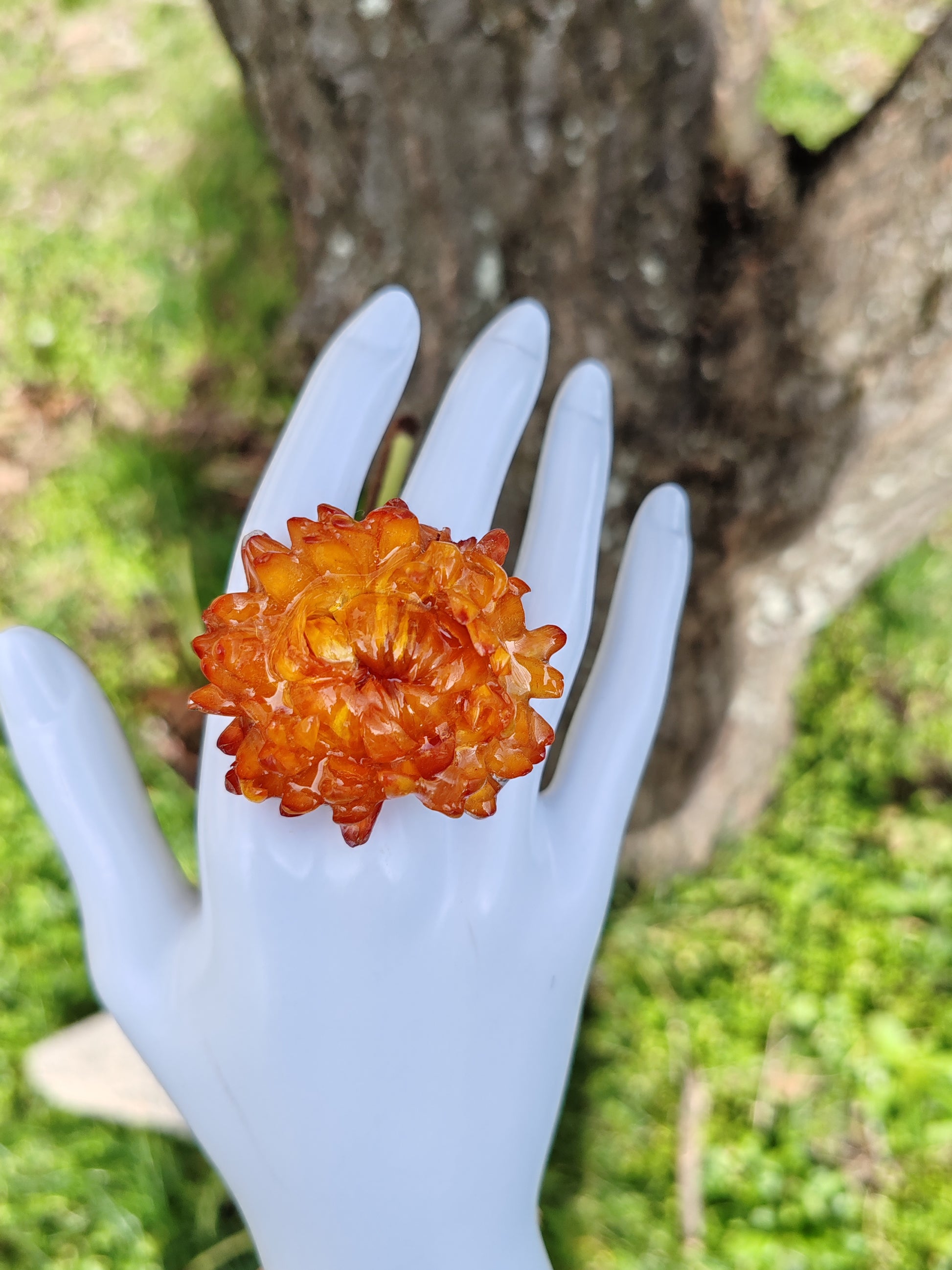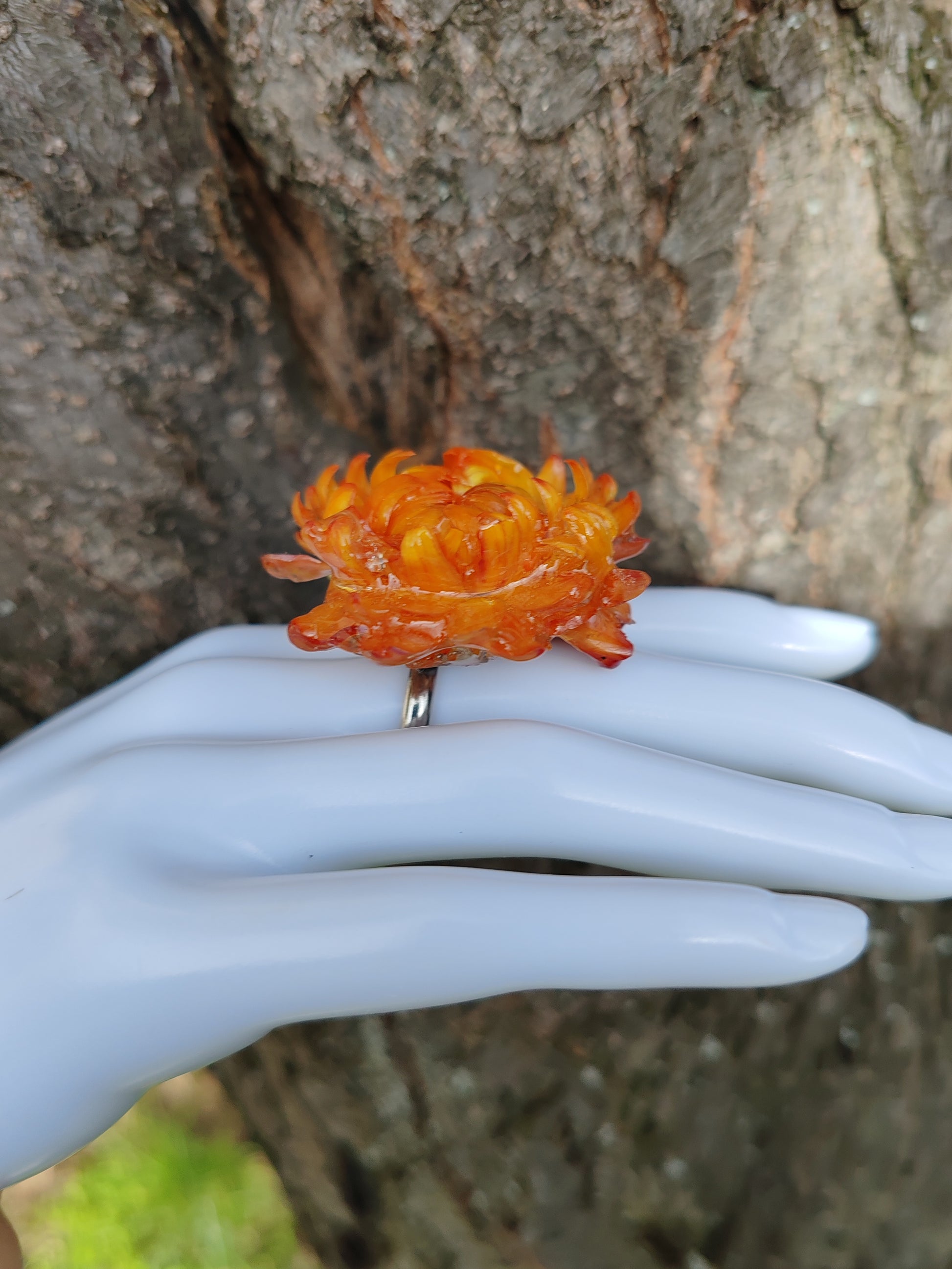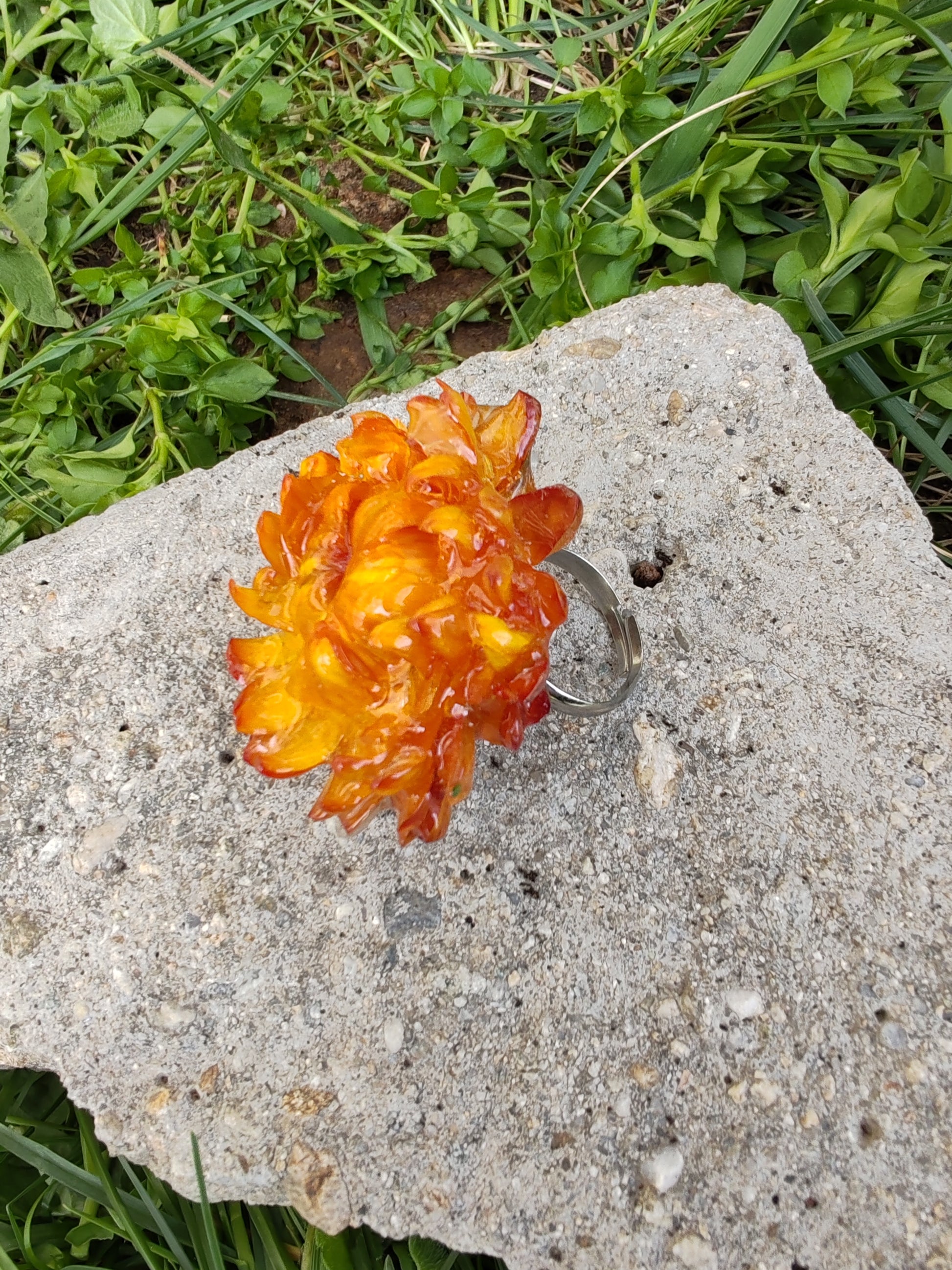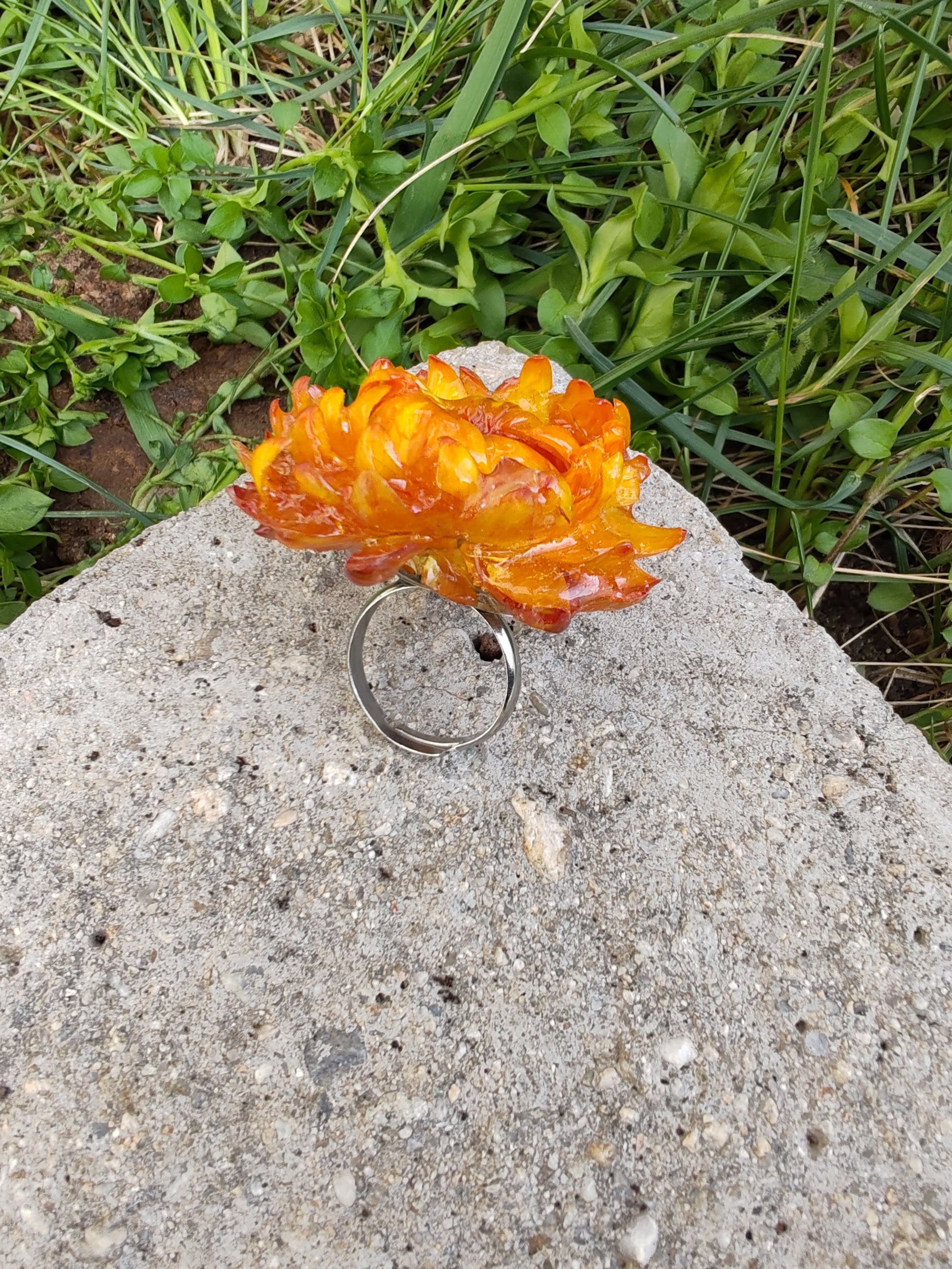 Красив пръстен с хелихризум ( безсмъртниче ), нежно обвита в епоксидна смола и поставена на регулируема месингова основа. Името произлиза от хелиос – слънце и злато, "златно слънце". Символ на любовта и красотата!