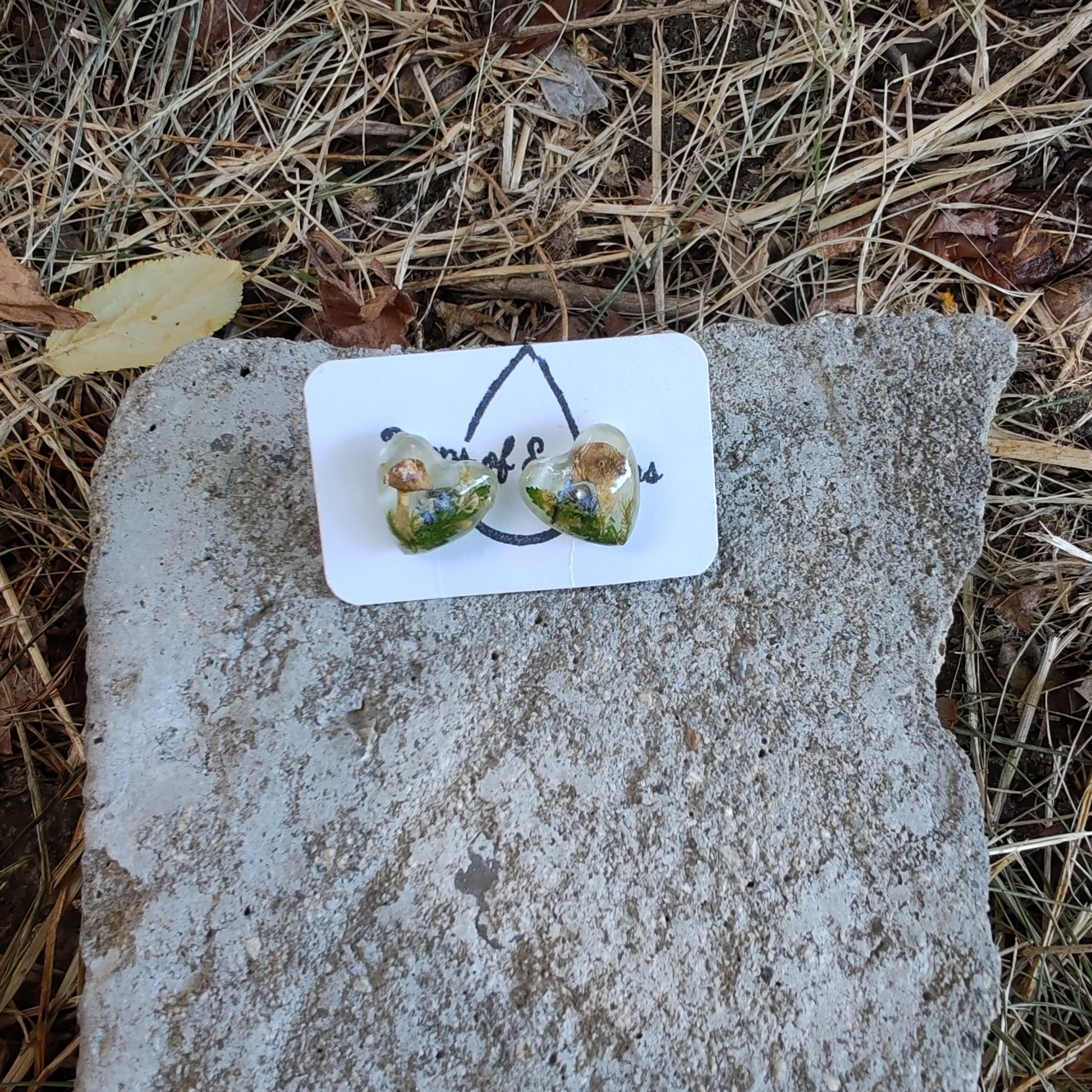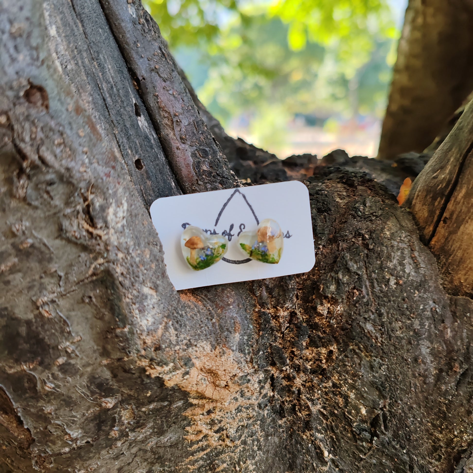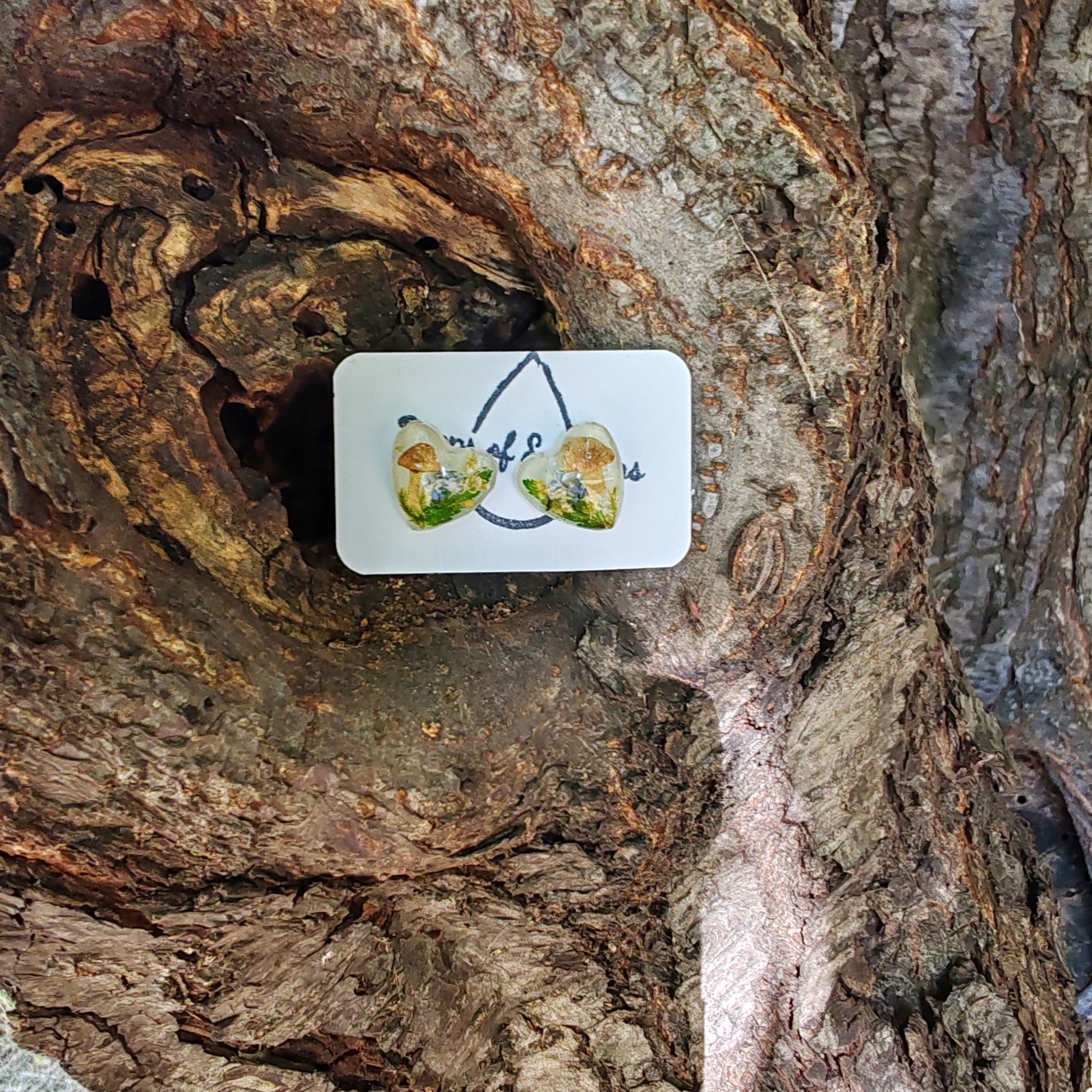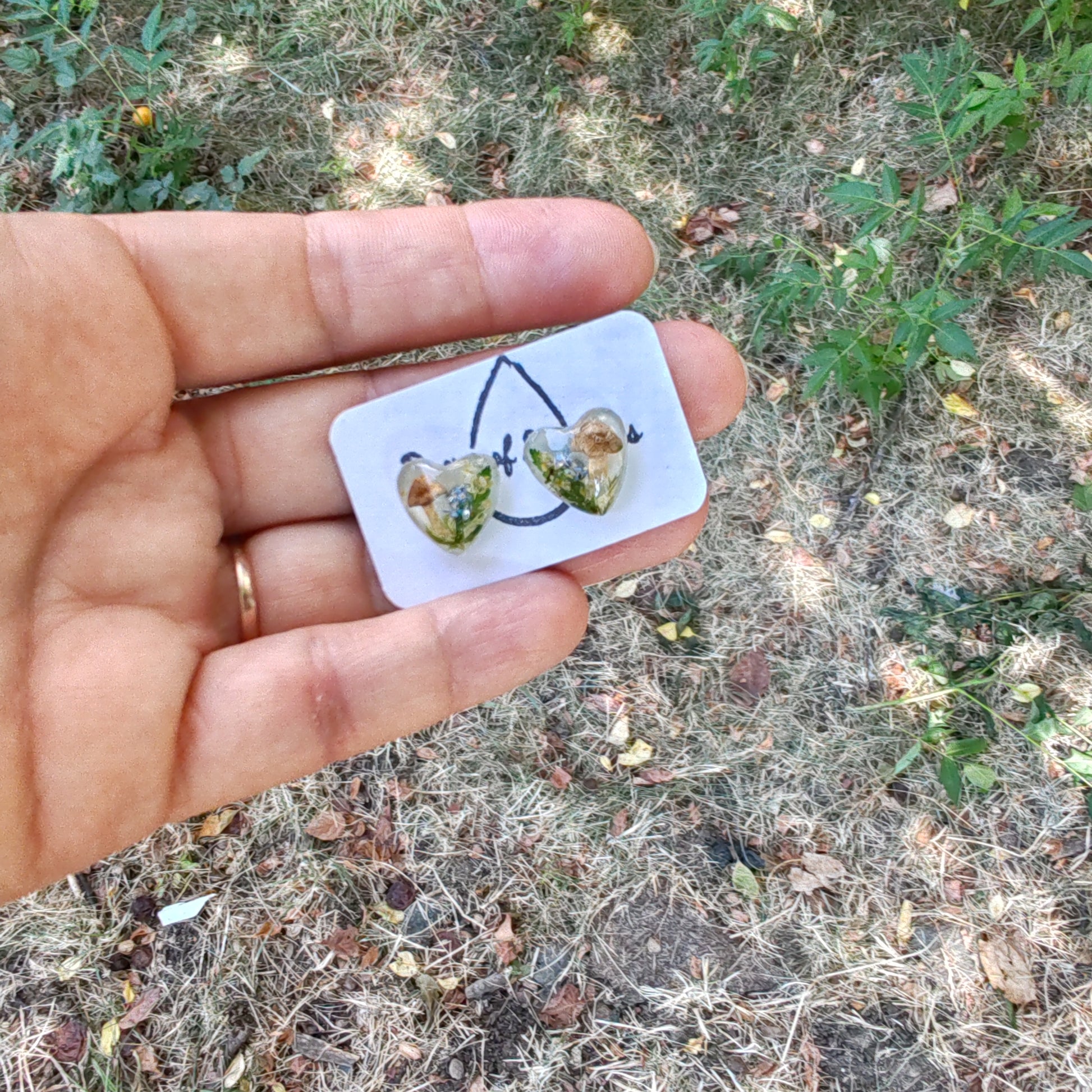Горски обеци с гъбки и незабравки, събрани и изсушени от нас.