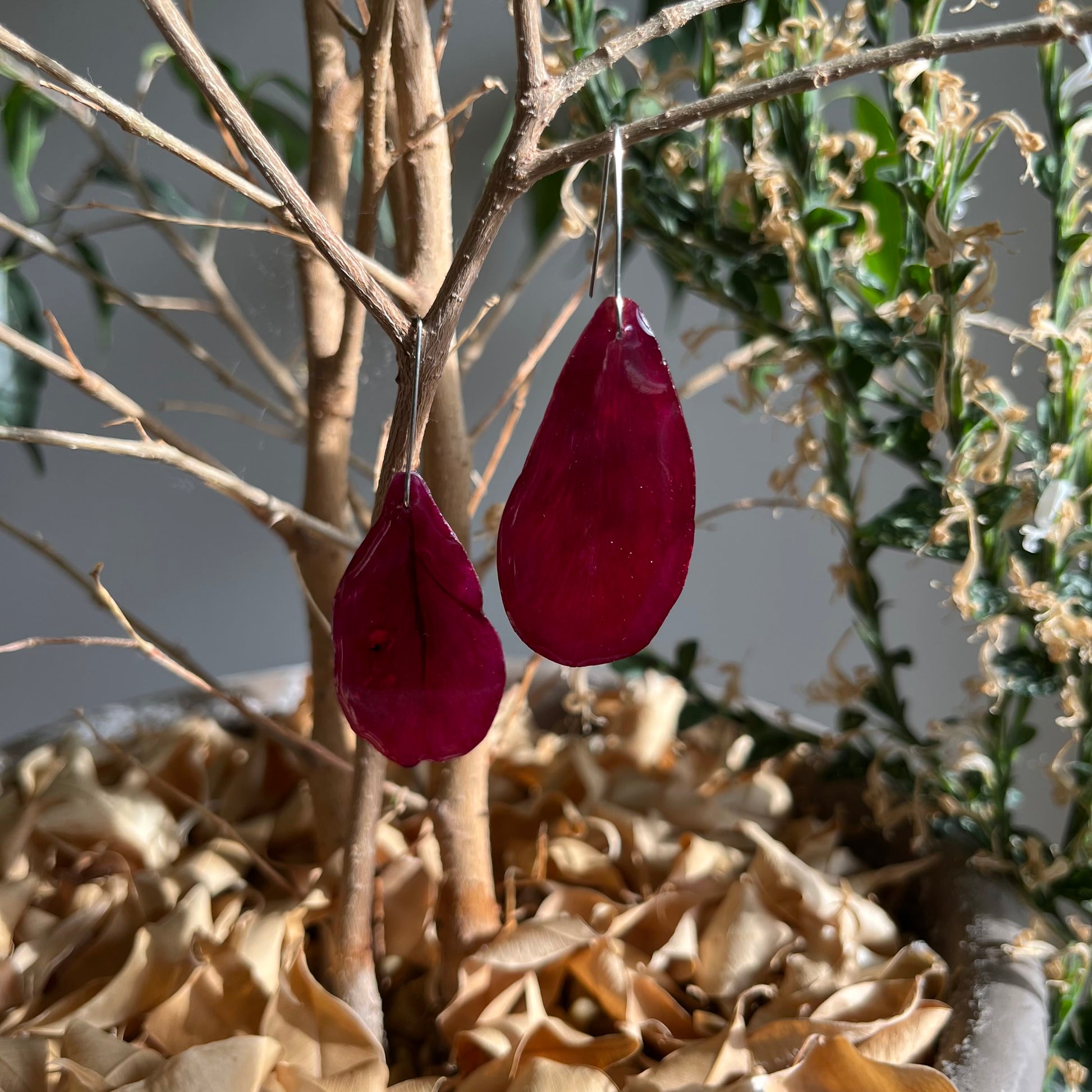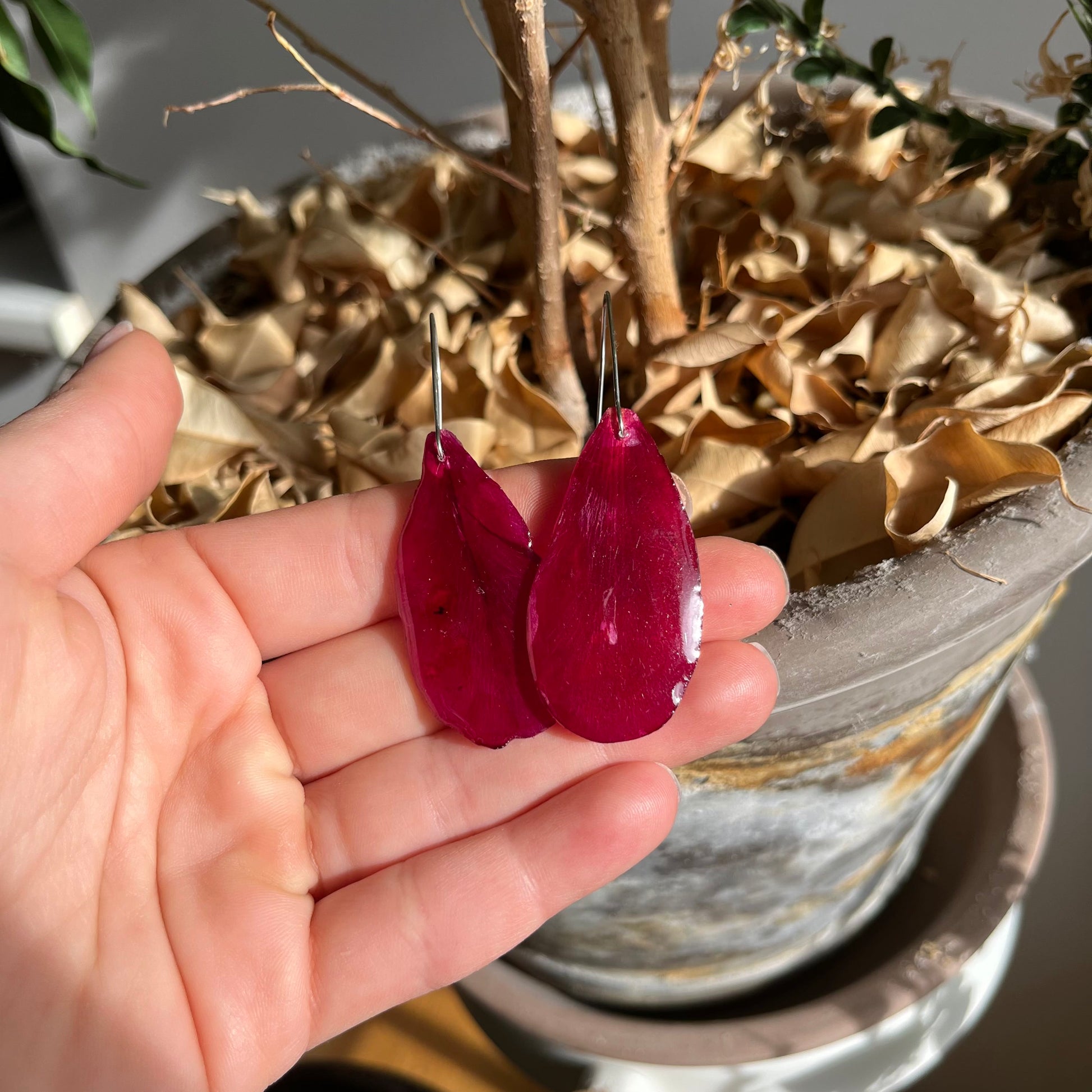 Материал: Металните части са от качествена стоматологична хипоалергенна тел. Обеците са изработени от напълно безопасна епоксидна смола, специално предназначена за бижутерски цели, което ги прави изключително издръжливи. Ако желаете те да са на силиконови куки, силиконов щифт или метален клипс, свържете се с нас.