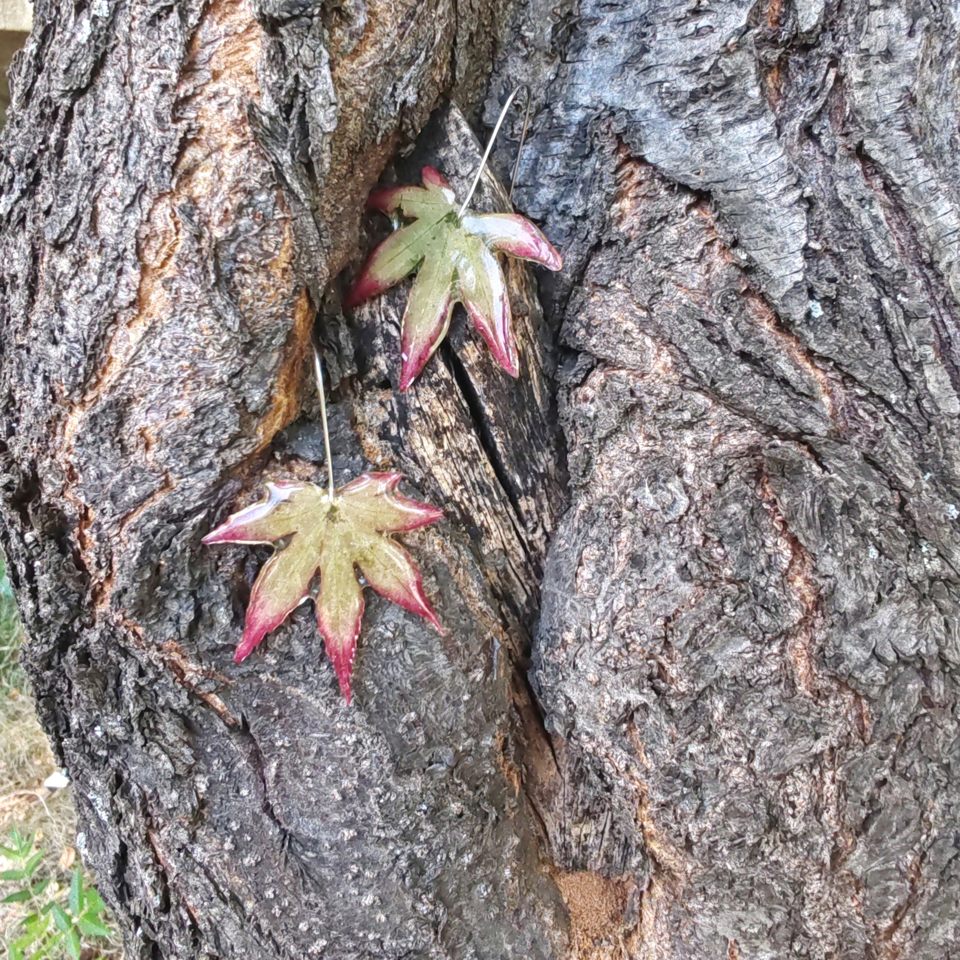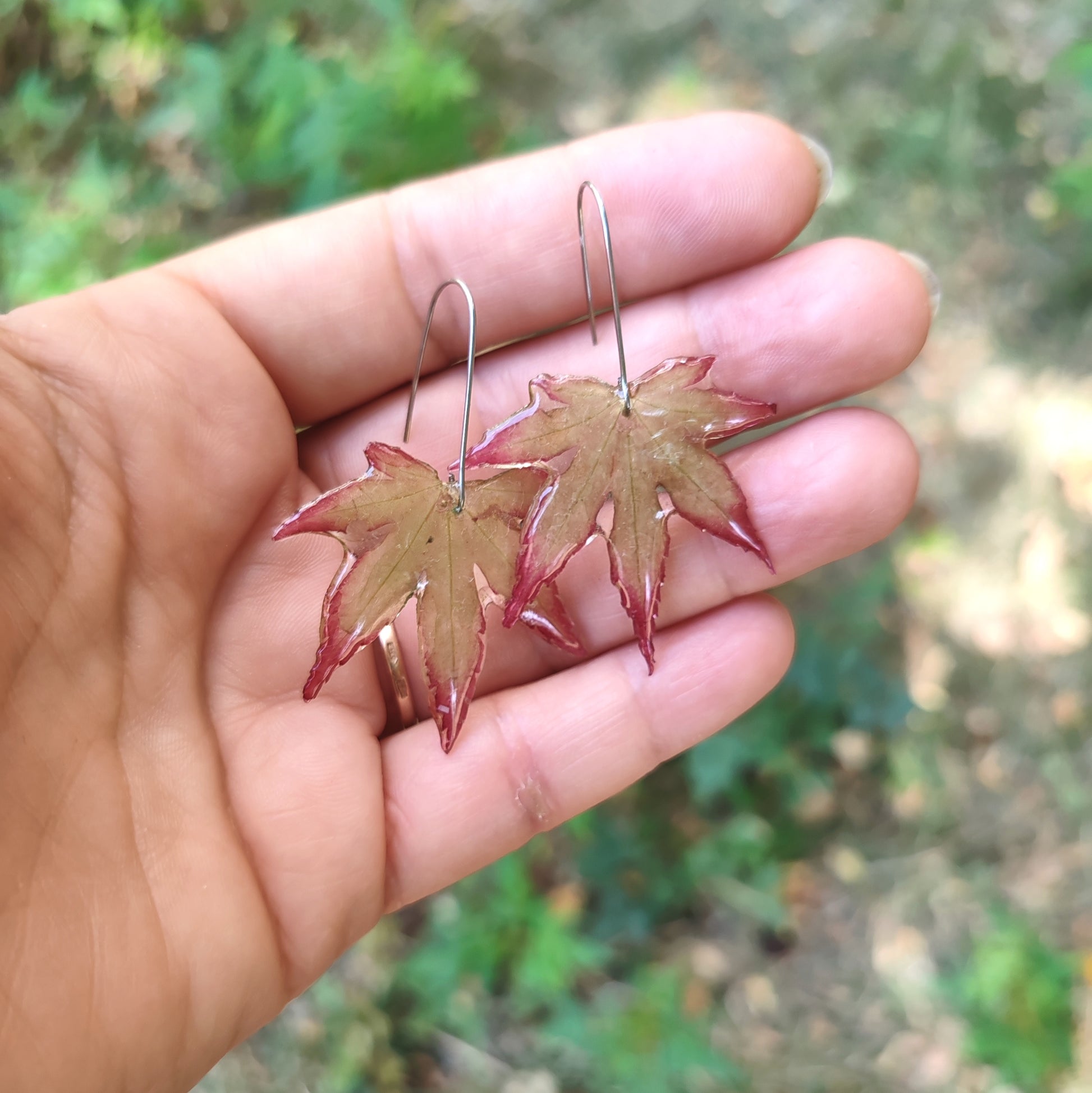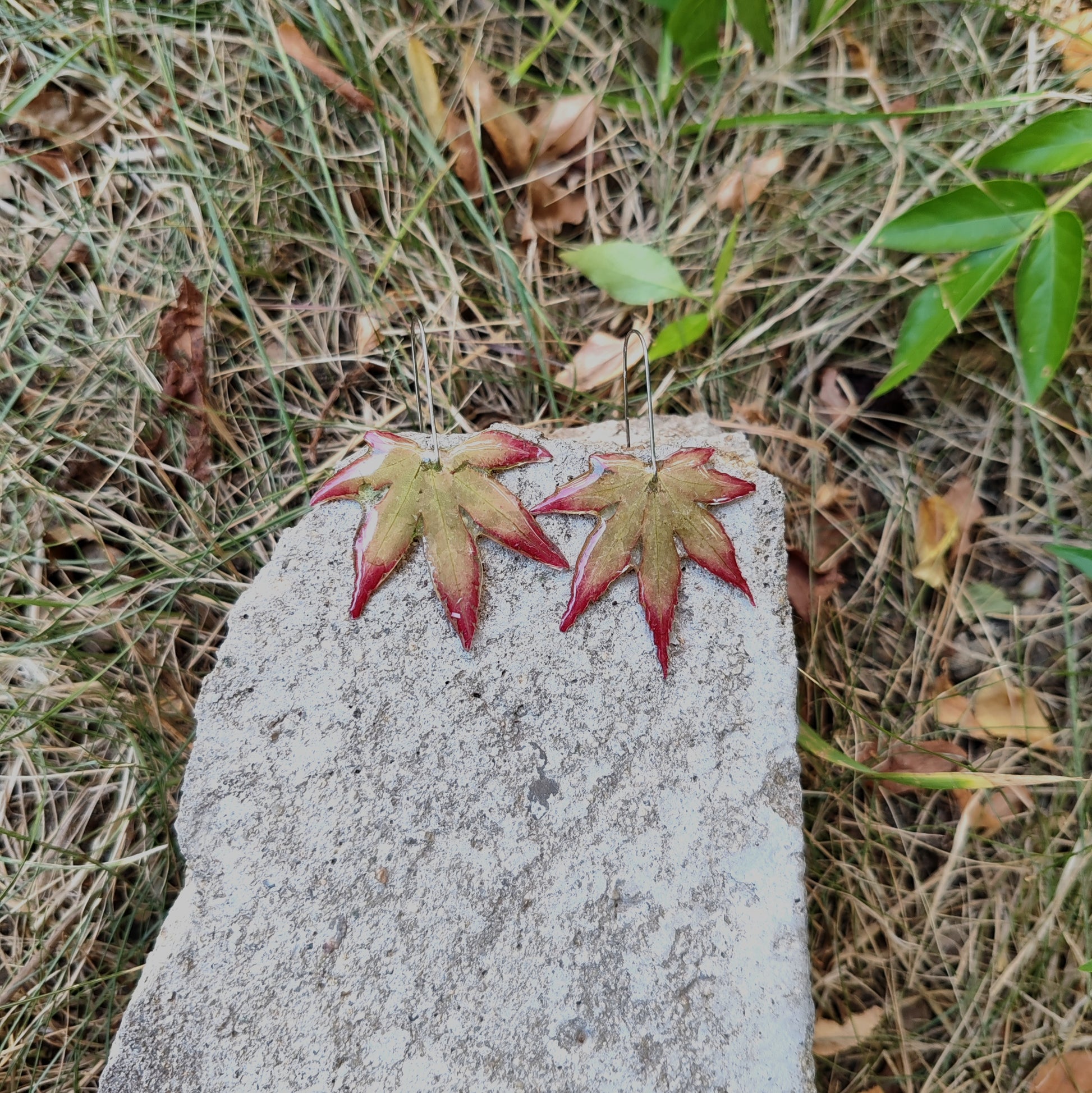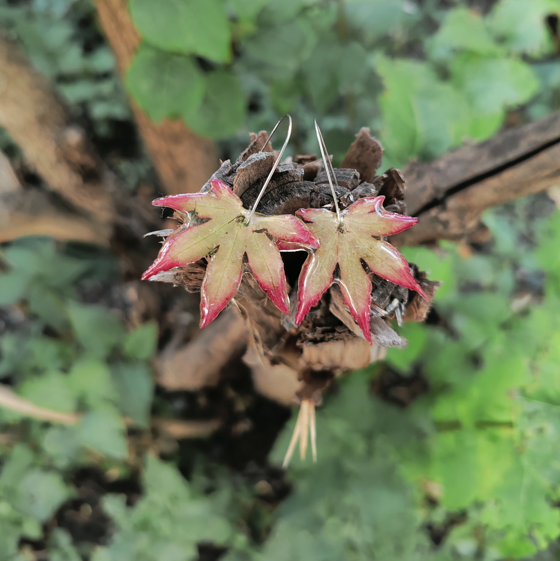 Тези красиви висящи обеци са направени от сушени кленови листенца, запазени с помощта на смола.  Кленовият лист – символ на плодородие и вечна любов в китайската и японската култура.