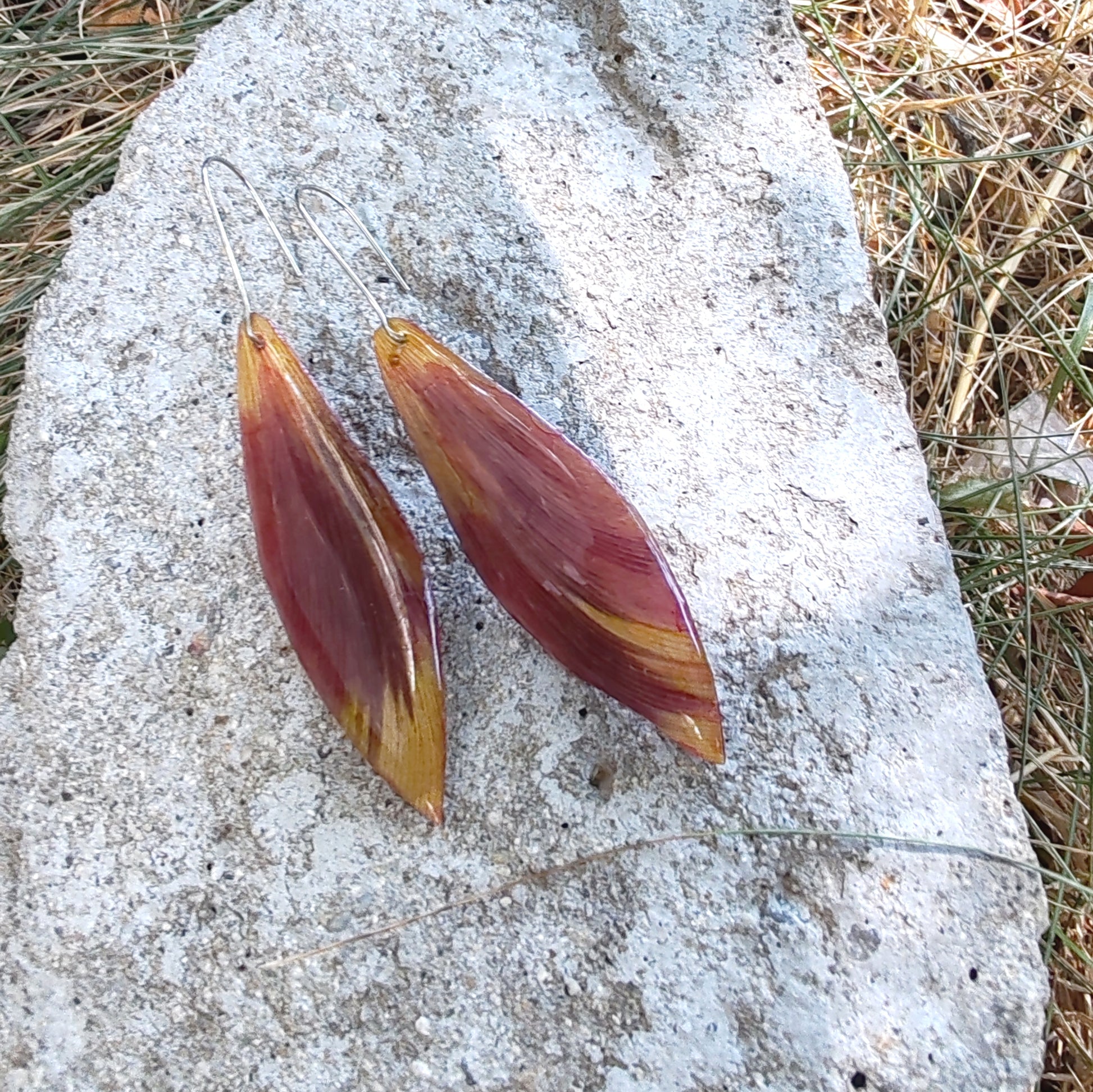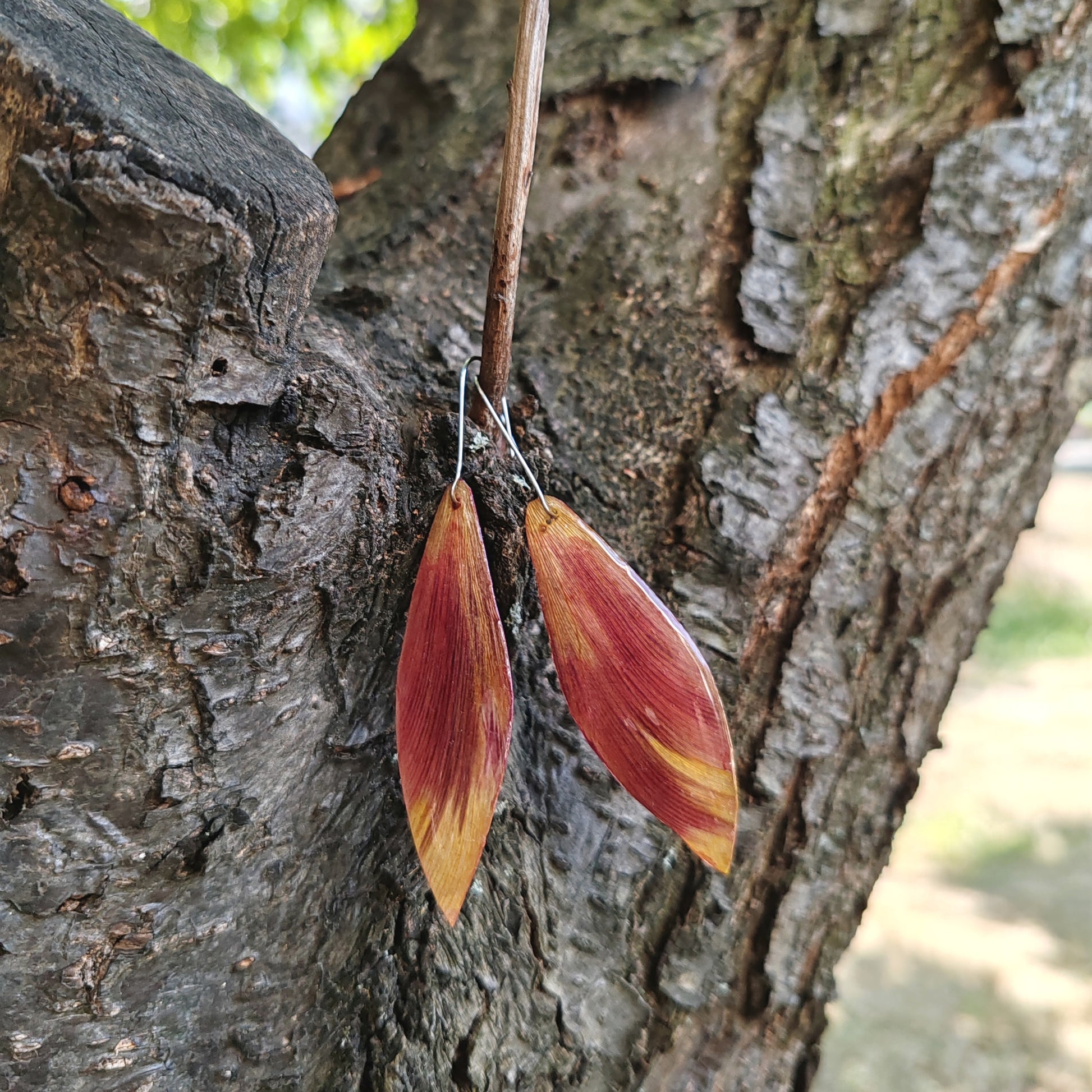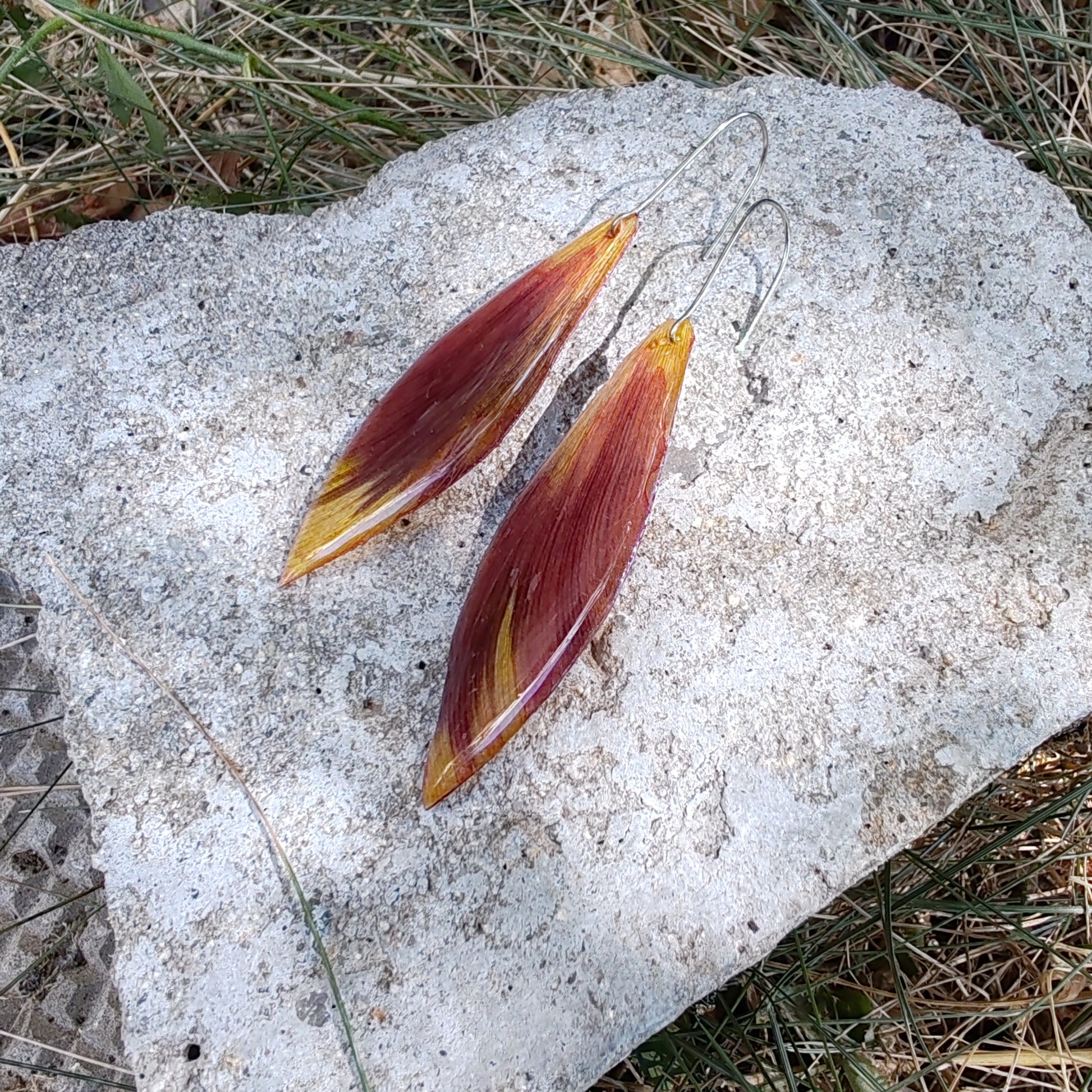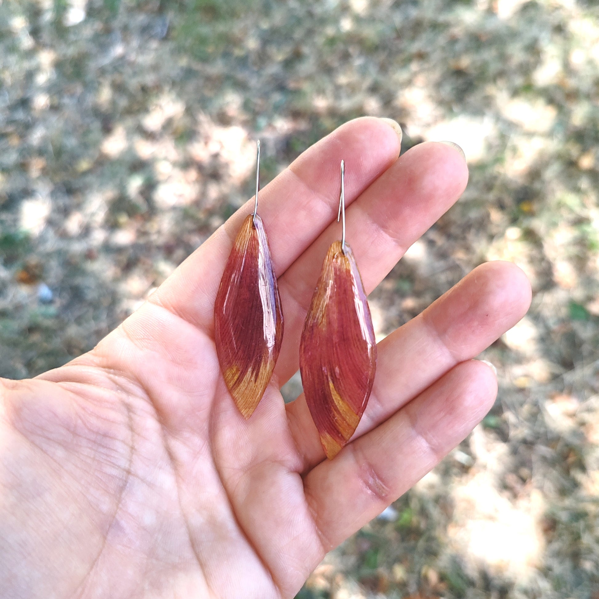 Тези красиви висящи обеци са направени от сушени листенца на лале, запазени с помощта на смола.