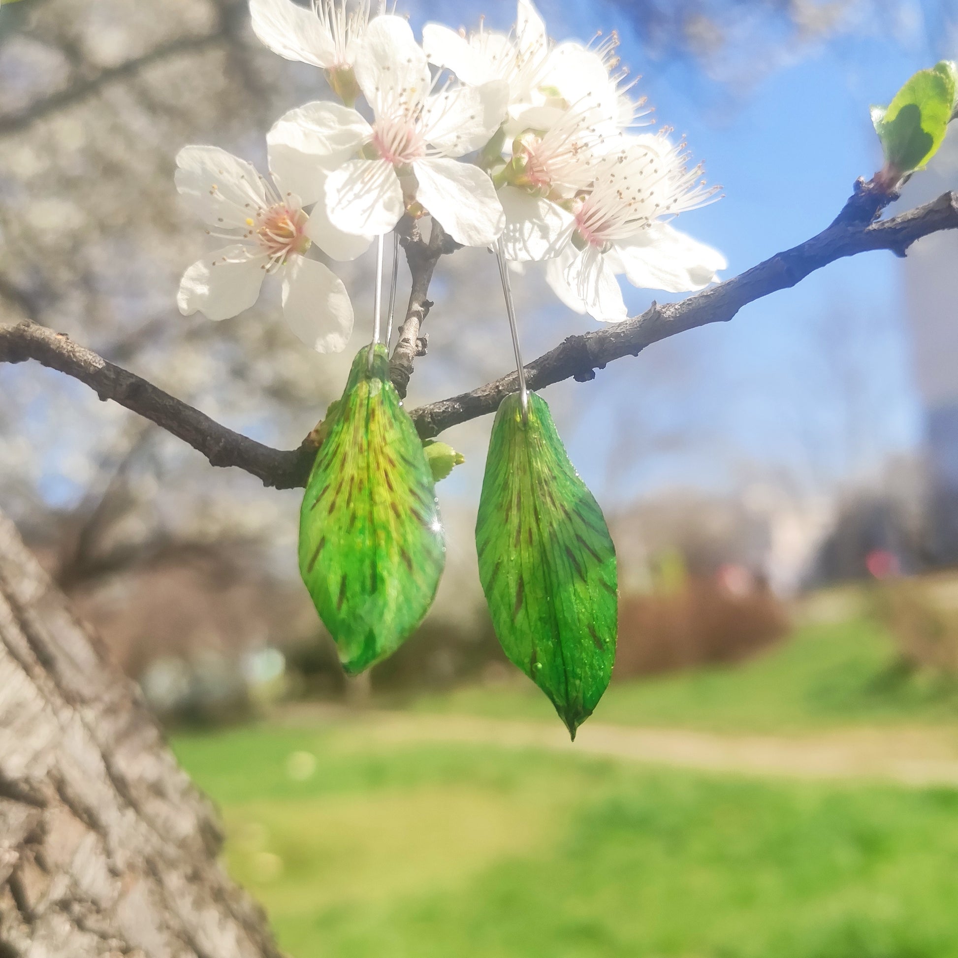 Материал: Металните части са от качествена стоматологична хипоалергенна тел. Обеците са изработени от напълно безопасна епоксидна смола, специално предназначена за бижутерски цели, което ги прави изключително издръжливи. Ако желаете те да са на силиконови куки, силиконов щифт или метален клипс, свържете се с нас.