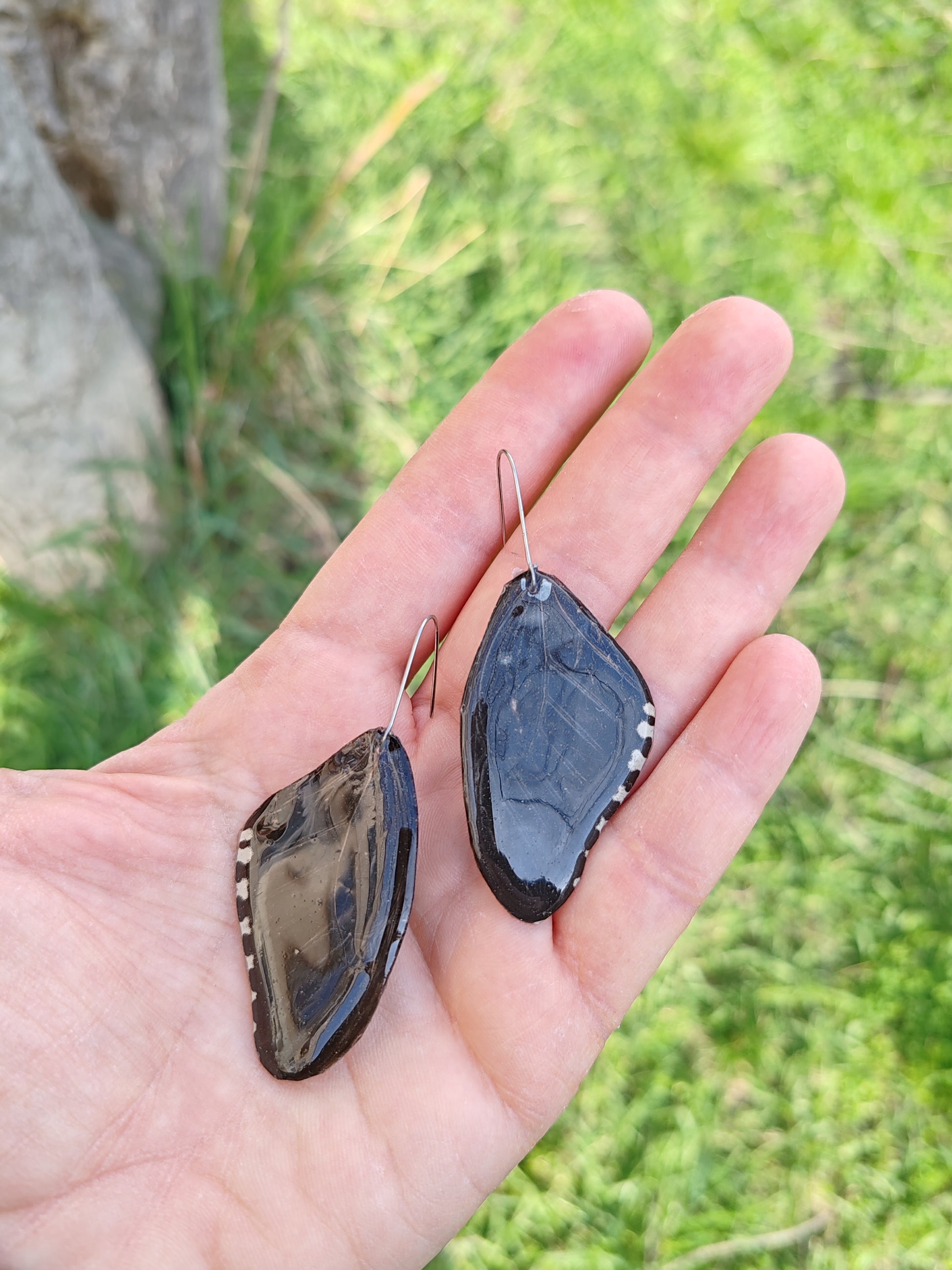 Обеци от пеперудени крилца, съхранени с помощта на бижутерска смола. ВАЖНО е да кажем, че ги взимаме от изложение на пеперуди след като вече не са живи и алтернативата е просто да бъдат извхърлени.
