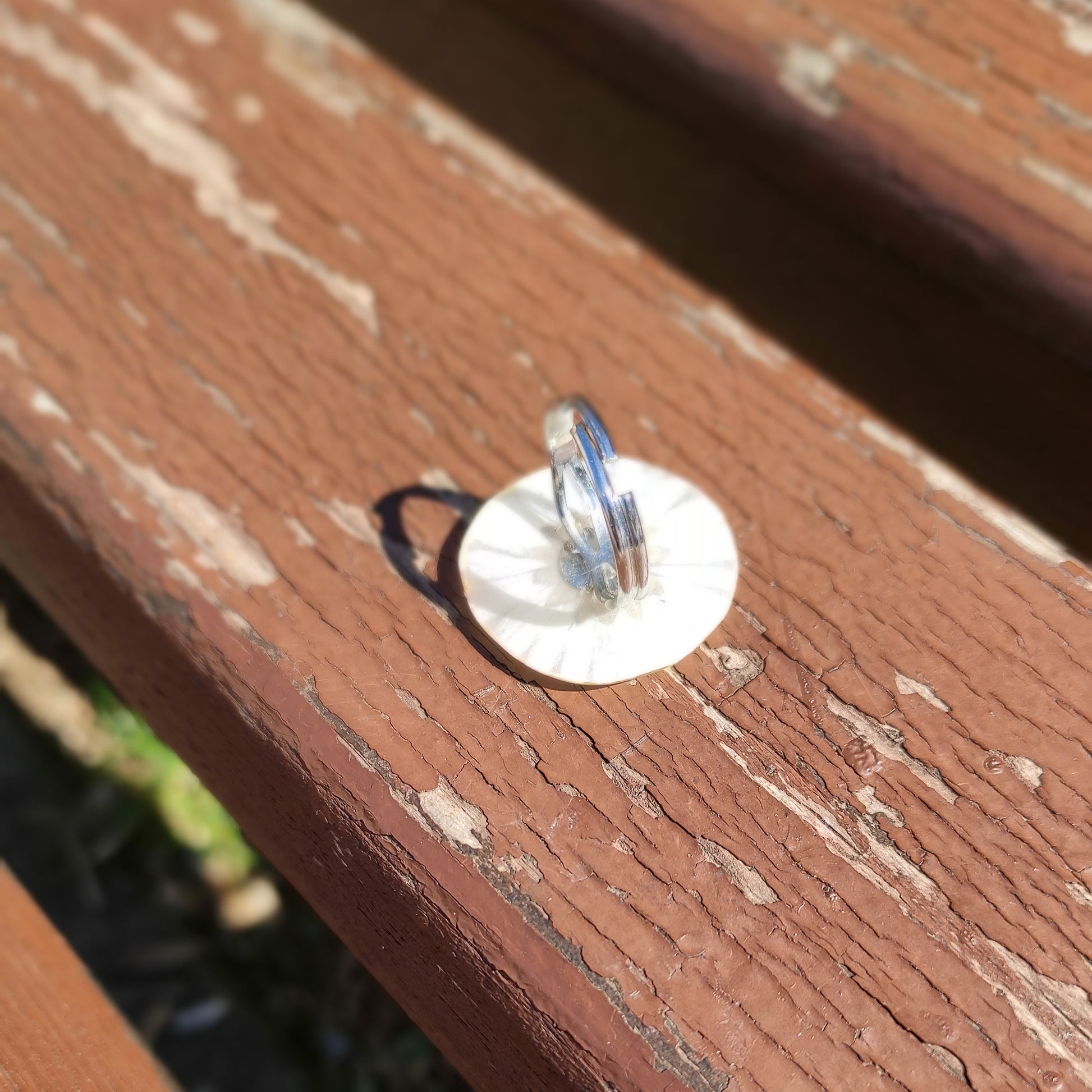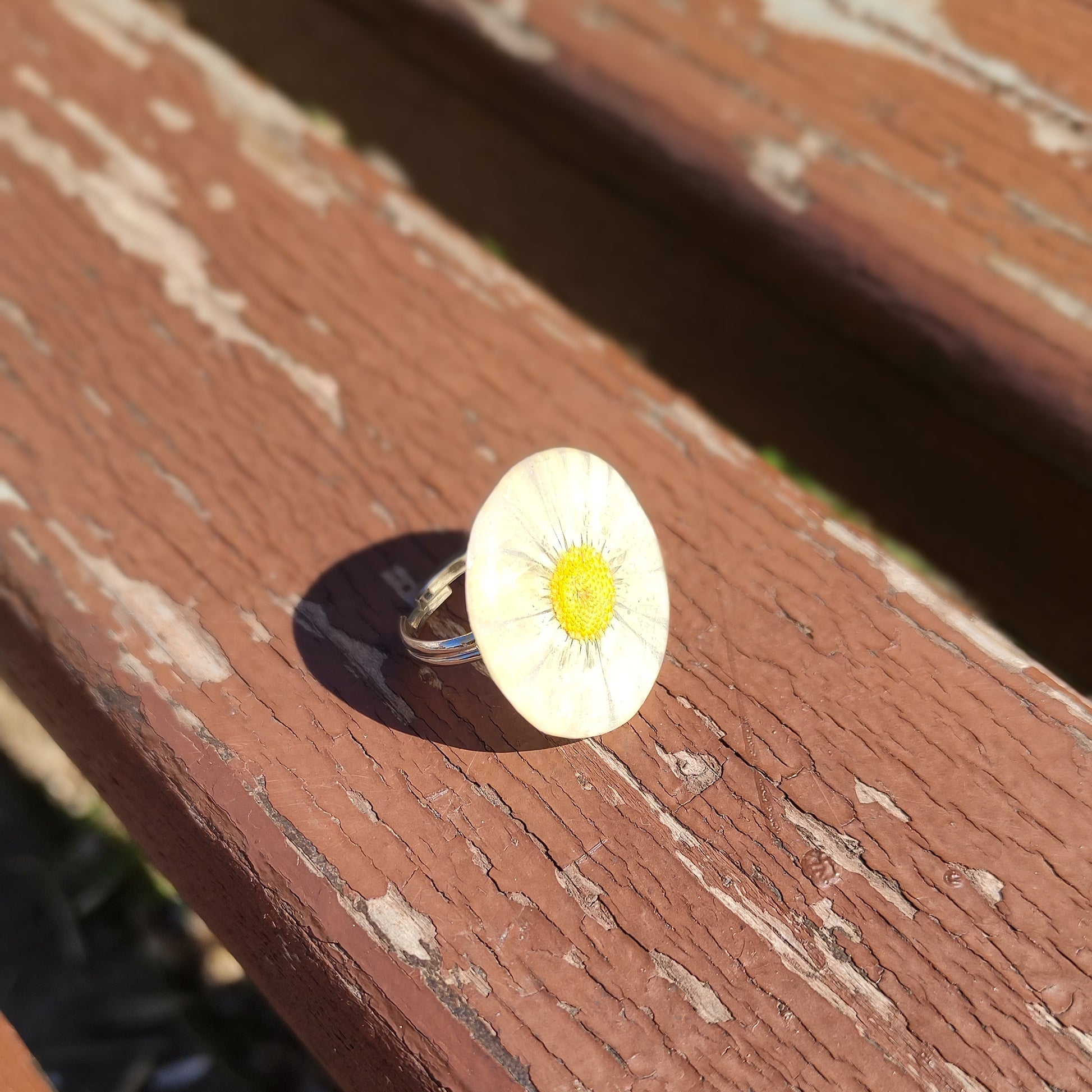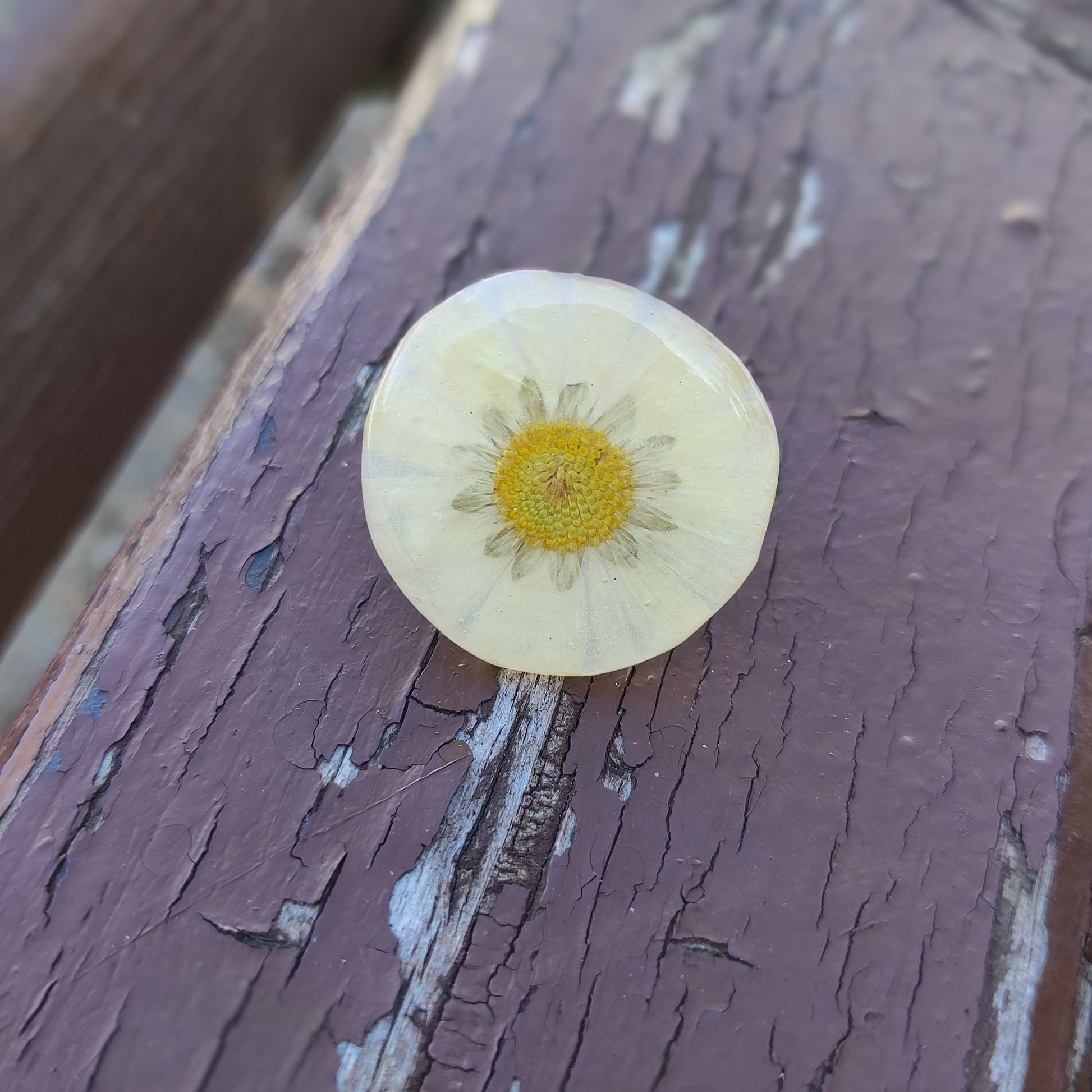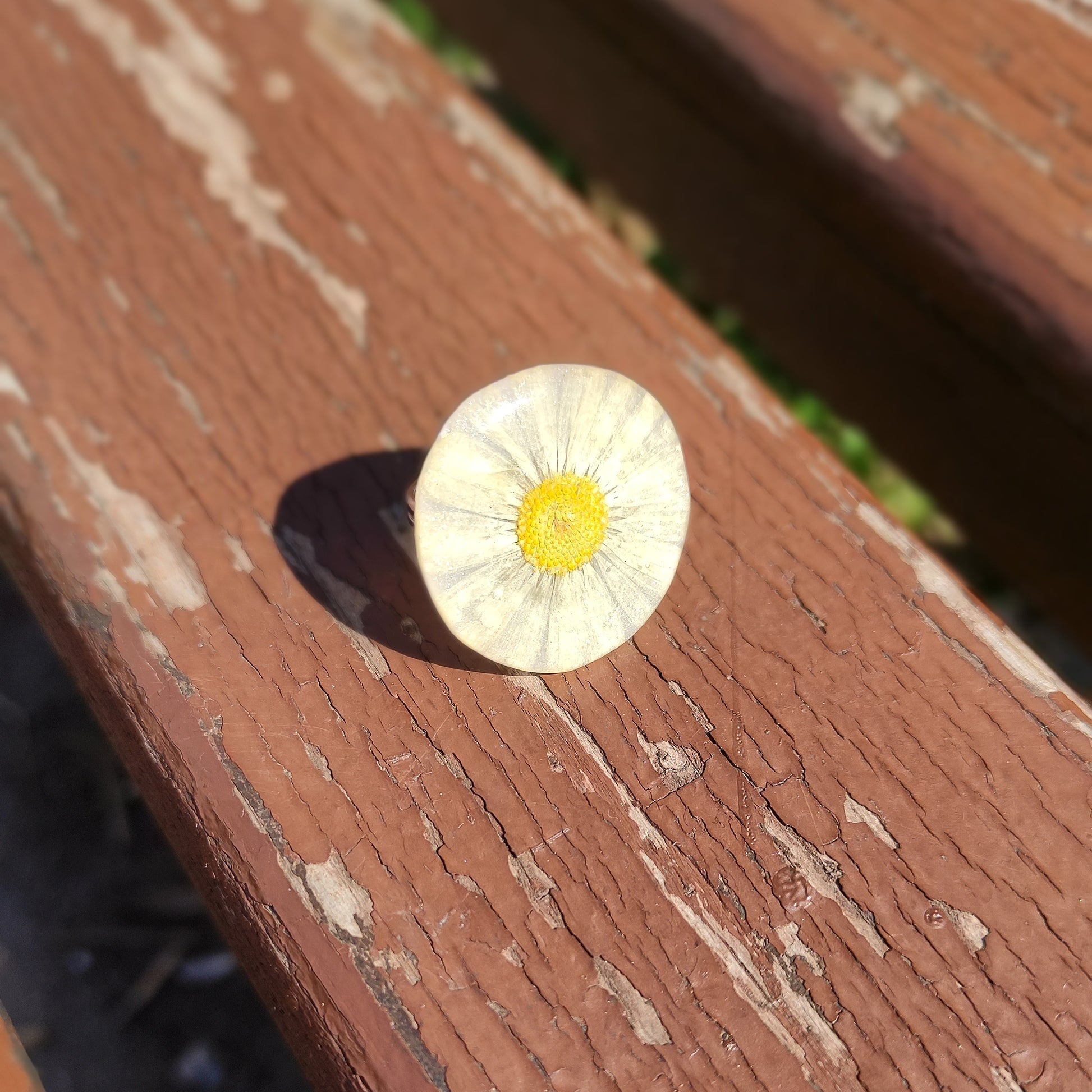 Красив пръстен с маргаритка, нежно обвита в епоксидна смола и поставена на регулируема месингова основа.