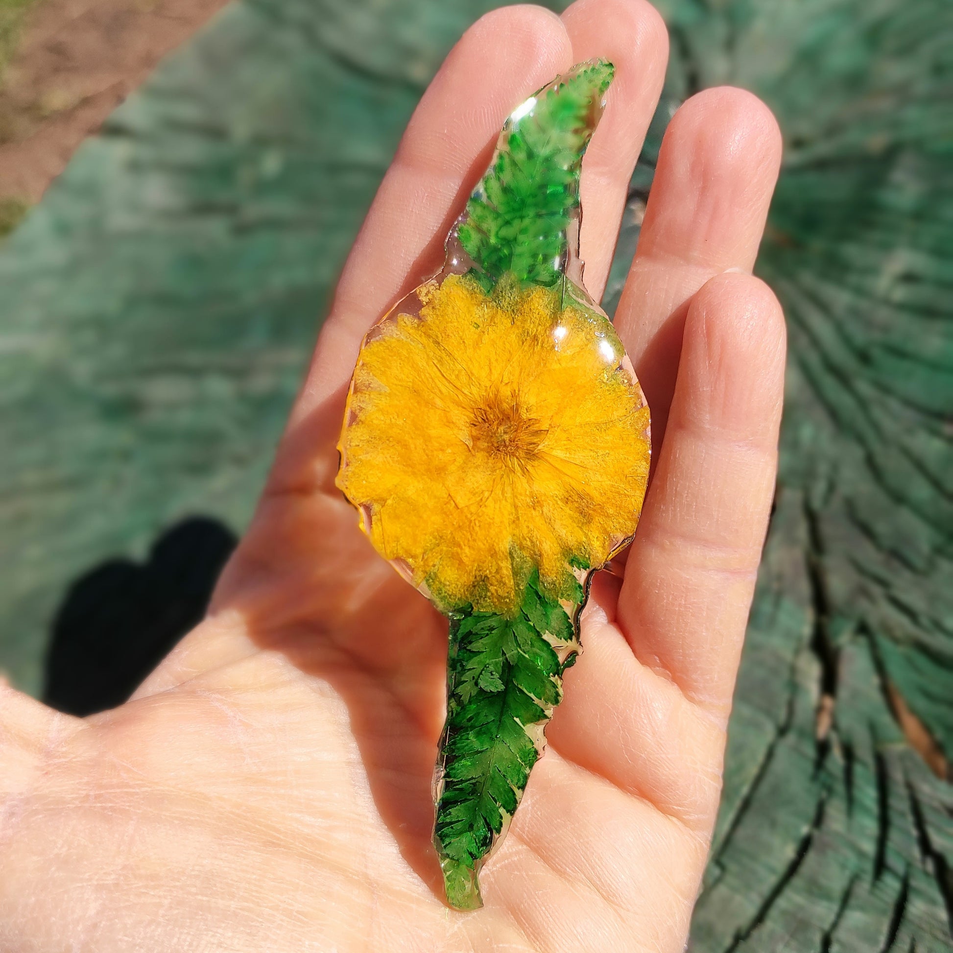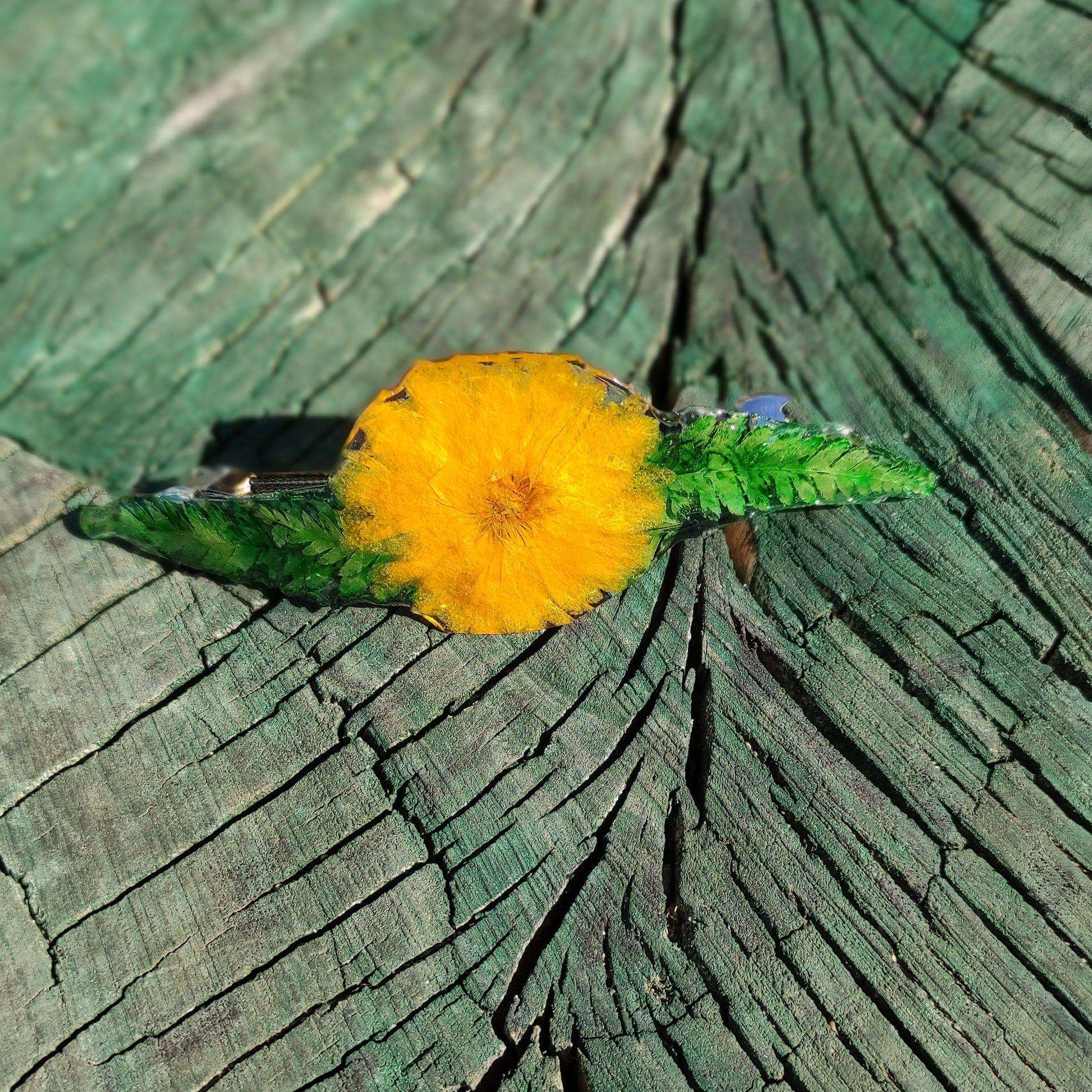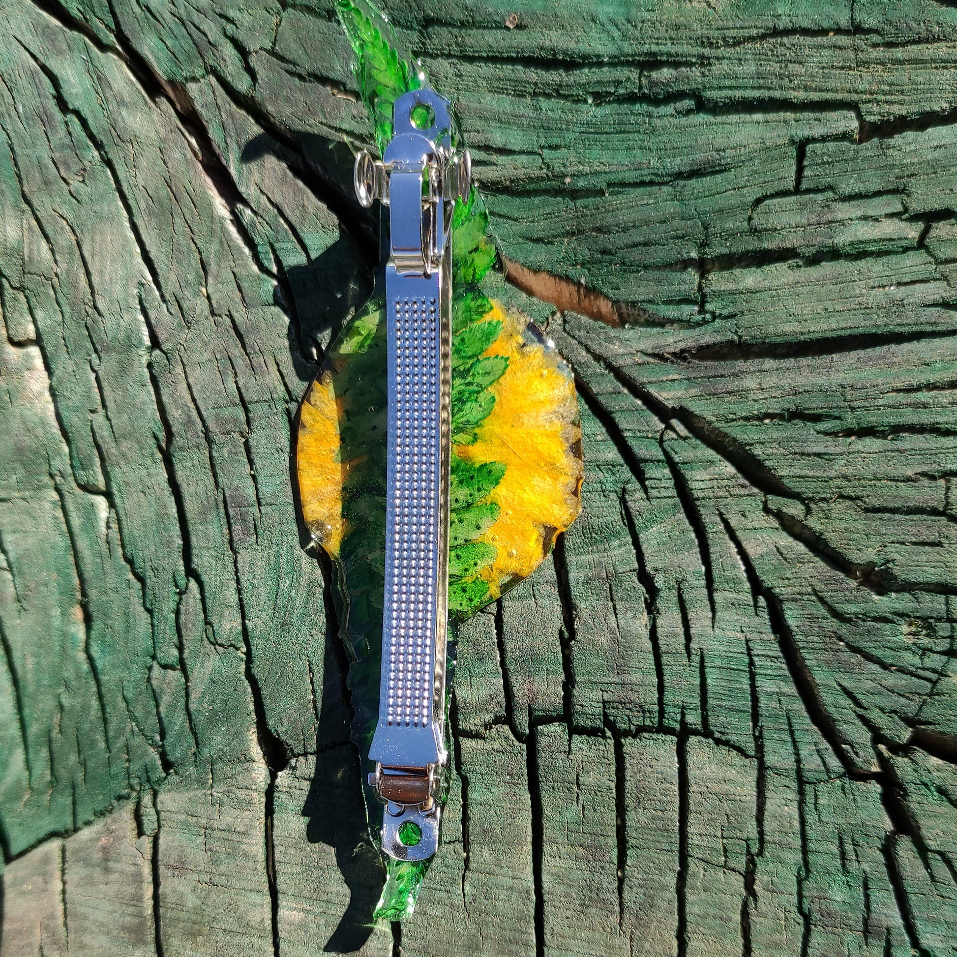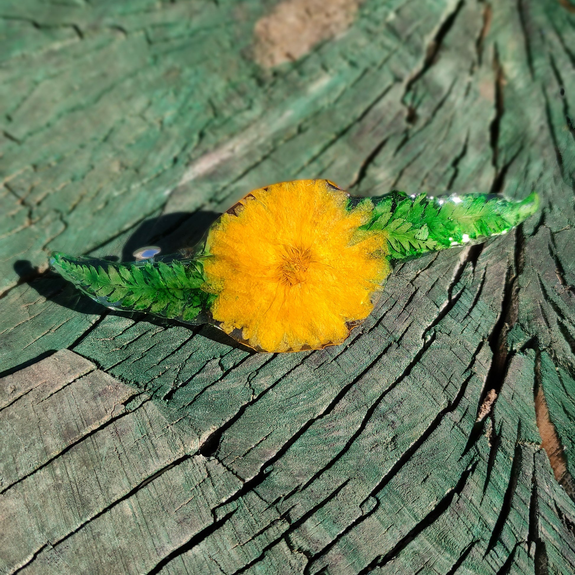 Шнола за коса с жълт цвят и зелени листенца, скрити в шнолата изработена от нас и обгърнати в епоксидна смола.