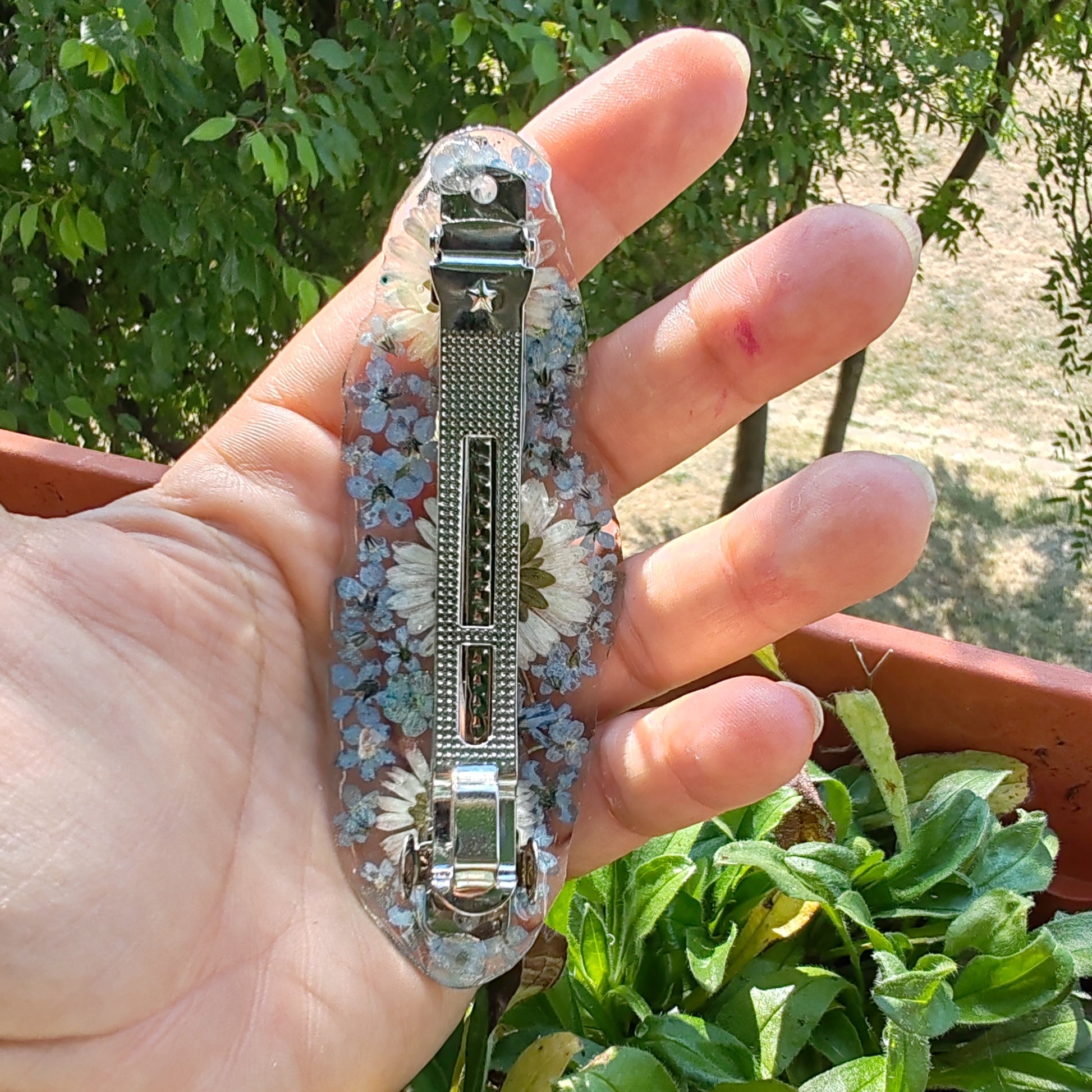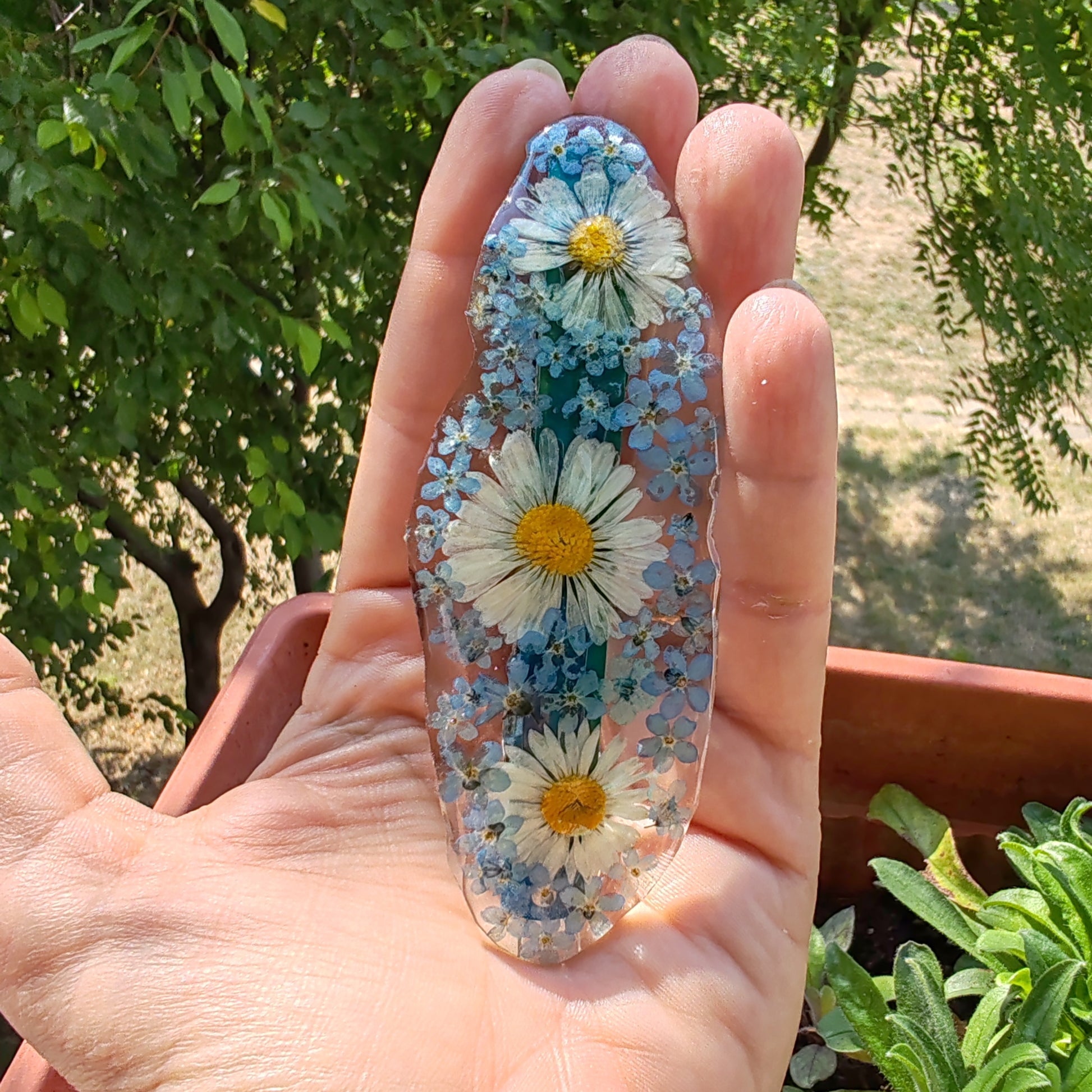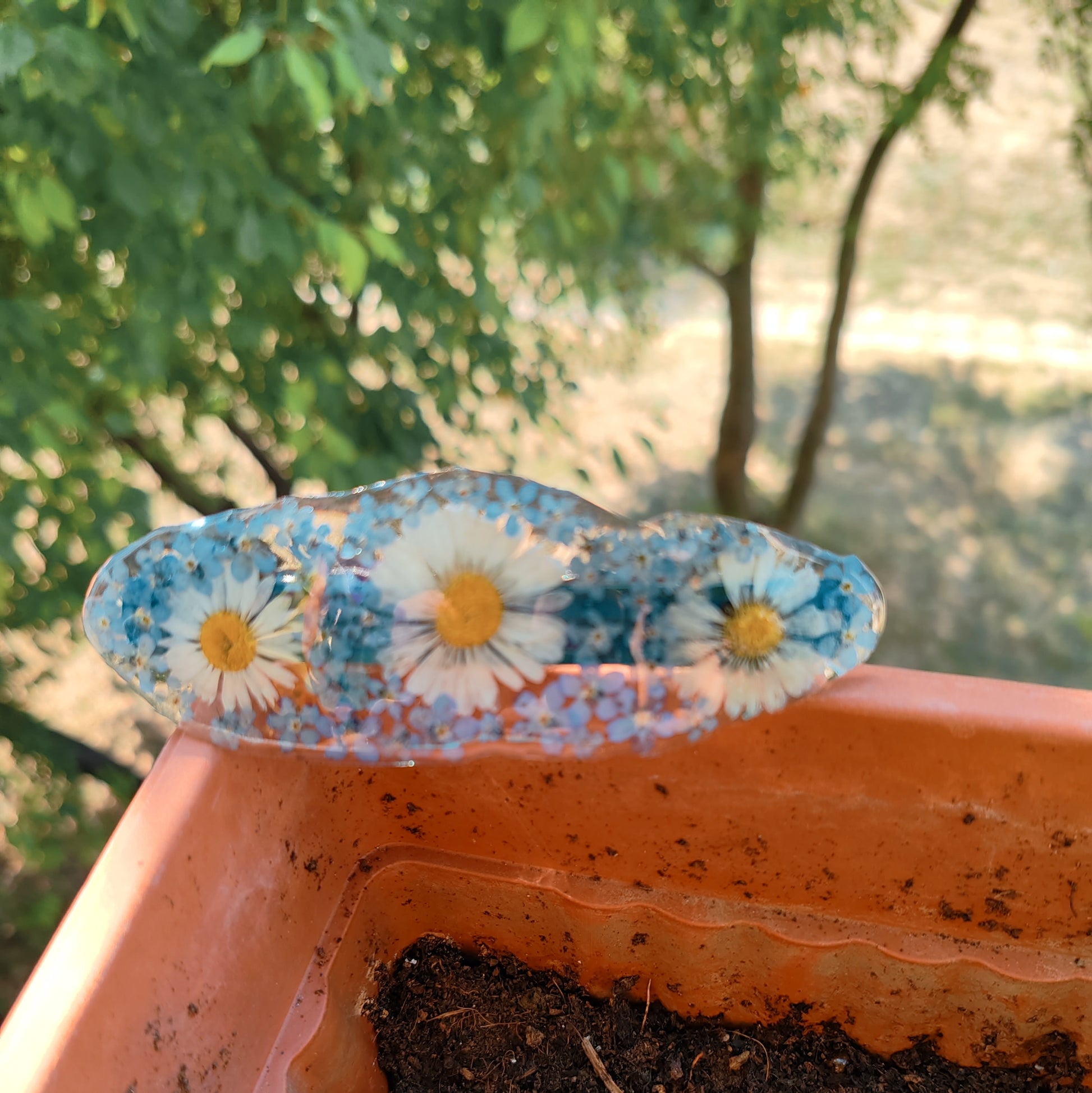 Бели маргаритки и сини незабравки са "хванати" в тази красива шнола, изработена от епоксидна смола. Маргаритката е станала символ на чистота, радост, любов и невинност, а незабравката е обещание за вечен спомен. Размерът на шнолата е 100 мм в частта на захващане.