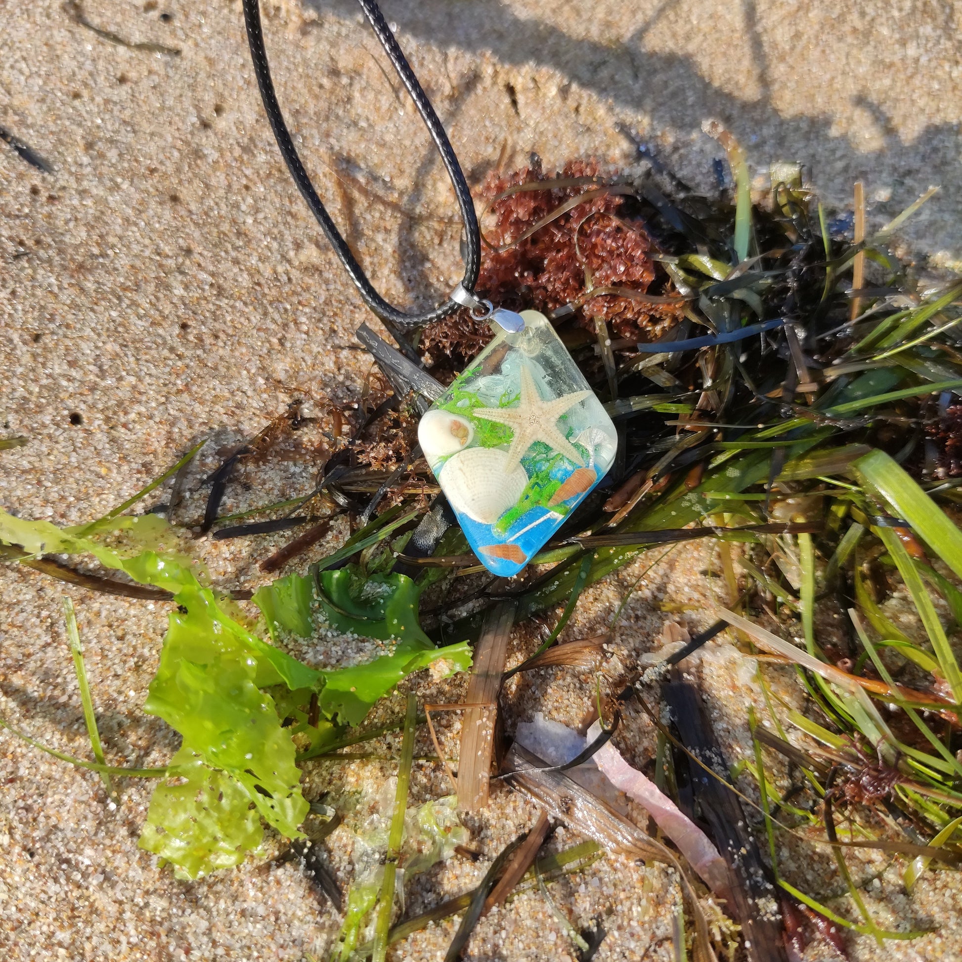 Материал: Бижуто е изработено от напълно безопасна епоксидна смола, специално предназначена за бижутерски цели, което прави изключително издръжливо. Дължината на верижката е 50 см. Предлагаме го всеки път с всеки, но може да заявите и стомана, както и различна дължина.